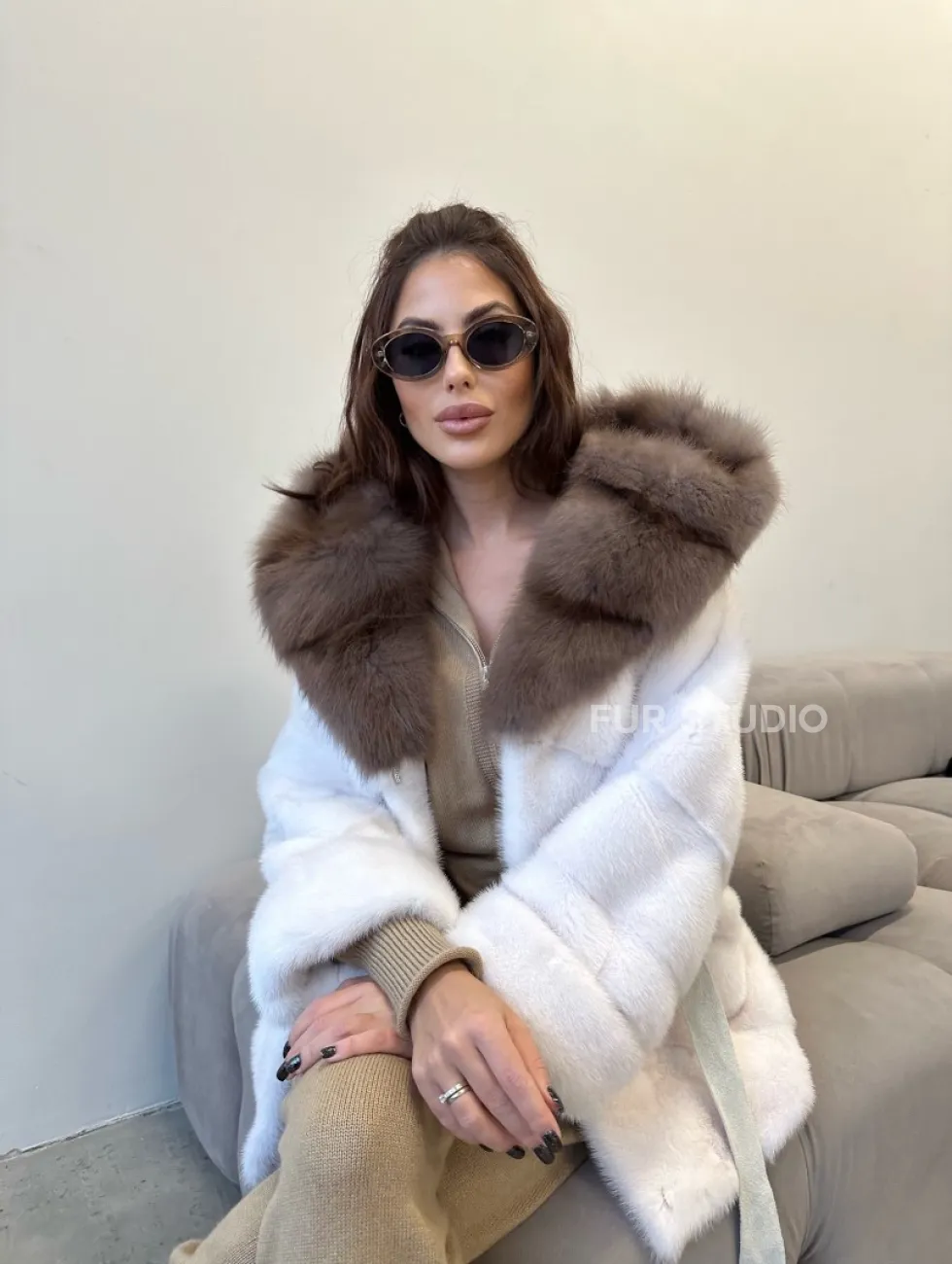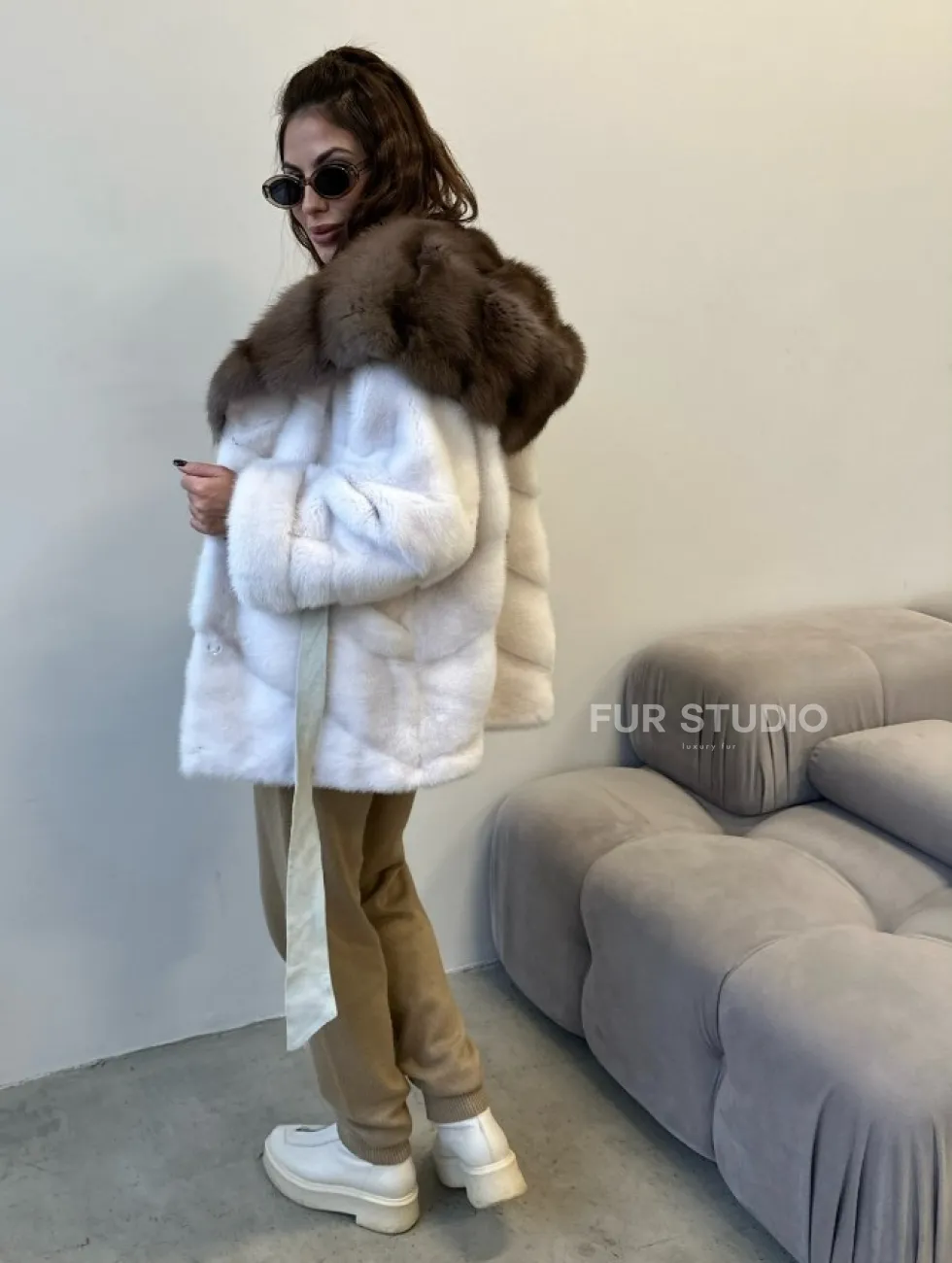 Мех данной шубы аукционная норка , цвет белый. Предлагается в размерах от 42 до 52. Длина модели 70-75 см, что выгодно подчеркивает фигуру девушек. Эта модель идеально подойдет для девушек и женщин, предпочитающих роскошные натуральные меха.
