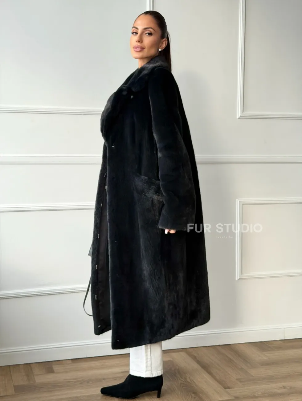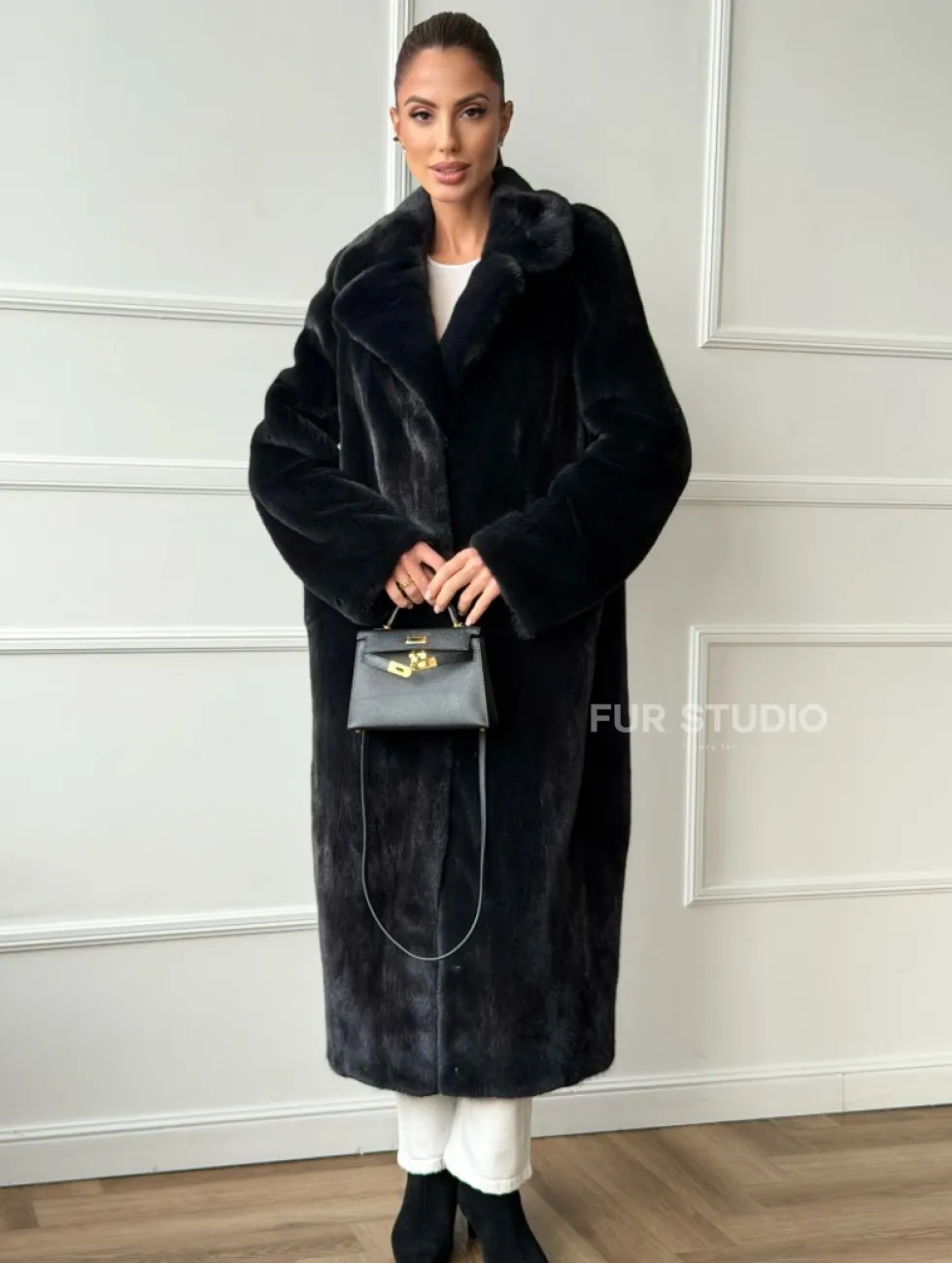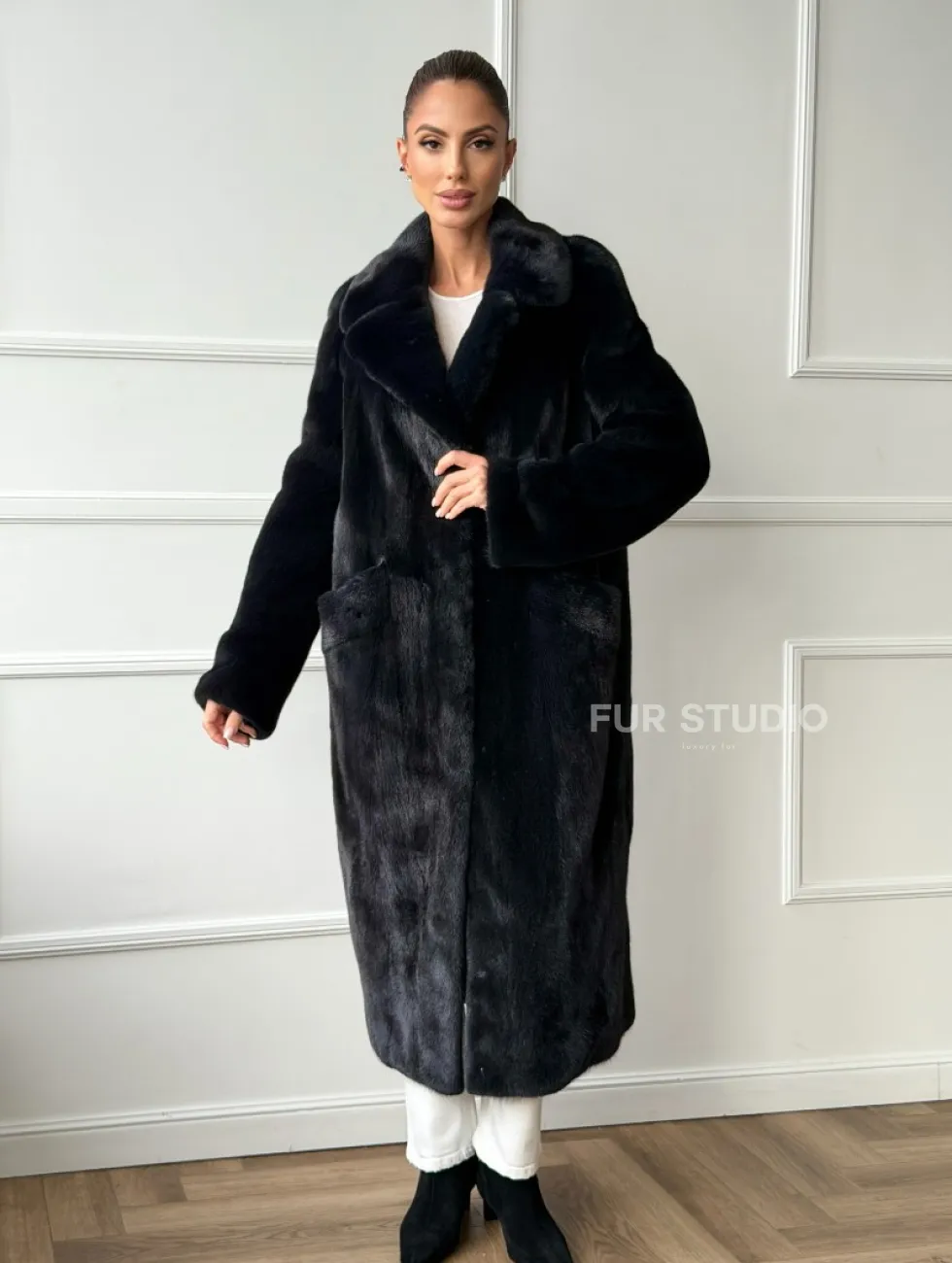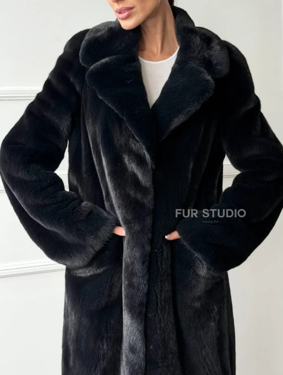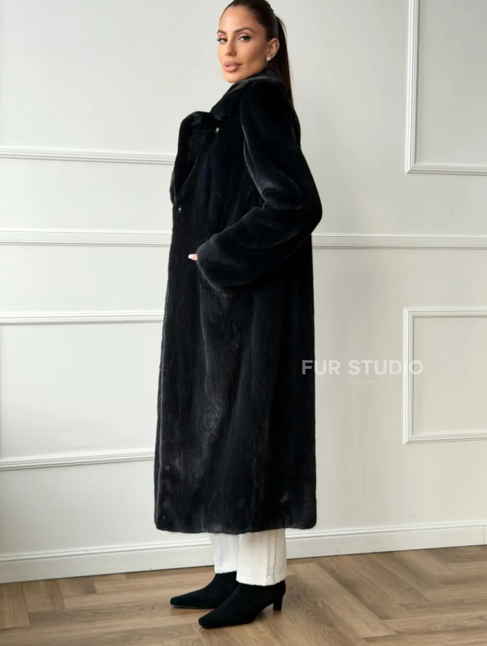 Мех данной шубы аукционная норка, цвет черный. Предлагается в размерах от 42 до 50. Длина модели 115-120 см, что выгодно подчеркивает фигуру девушек. Эта модель идеально подойдет для девушек и женщин, предпочитающих роскошные натуральные меха.