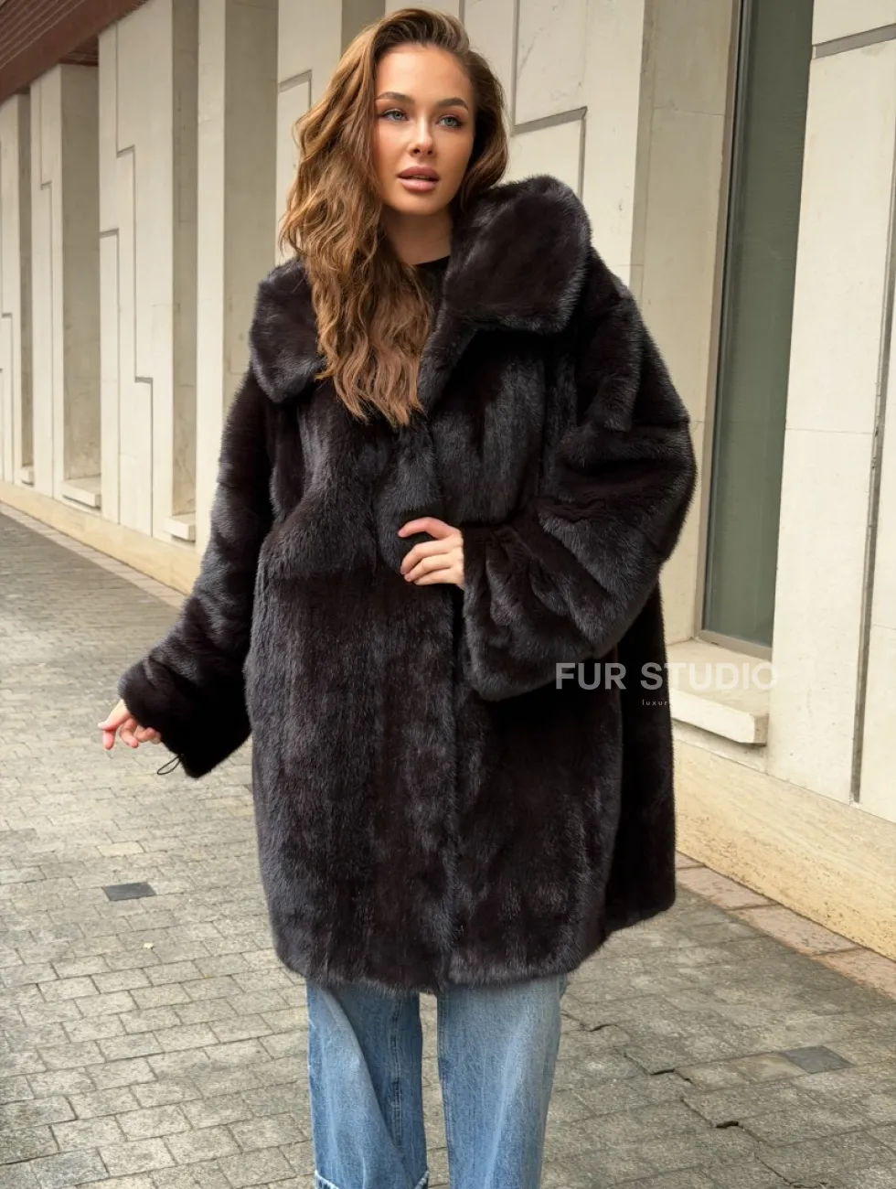 Мех данной шубы аукционная норка, цвет коричневый. Предлагается в размерах от 46 до 52. Длина модели 90-95 см, что выгодно подчеркивает фигуру девушек. Эта модель идеально подойдет для девушек и женщин, предпочитающих роскошные натуральные меха.