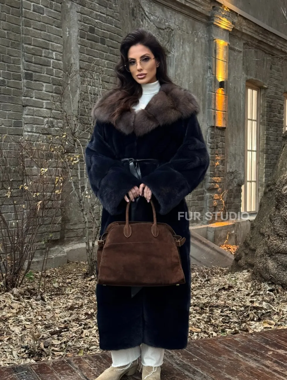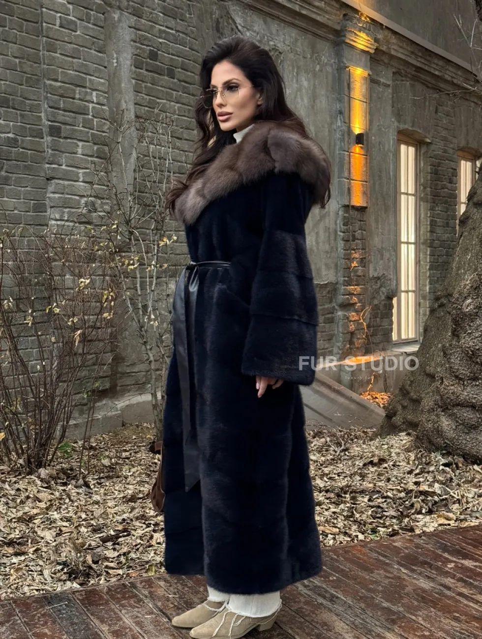Мех данной шубы аукционная норка, цвет синий. Предлагается в размерах от 42 до 50. Длина модели 125-130 см, что выгодно подчеркивает фигуру девушек. Эта модель идеально подойдет для девушек и женщин, предпочитающих роскошные натуральные меха.