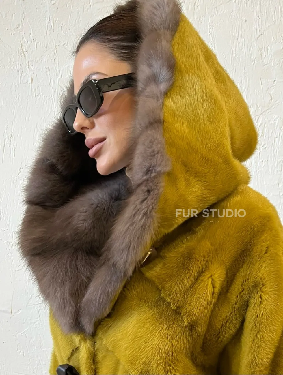 Норковая шуба с капюшоном куница - цвет горчичный - выбор дам, которые любят оригинальность. Горчичный цвет редкость среди меховых изделий. Уникальное сочетание меха норки и куницы делают модель оригинальной. Длина покрывает все, что необходимо и это идеально для девушек, которые любят носить мини в холодное время года. Мягкий мех приятен на ощупь и неприхотлив в уходе. Изделие невесомо и практически не ощущается на теле.