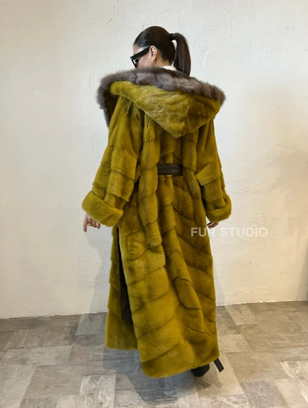 При этом в шубе будет тепло в холодную зиму. Шикарный капюшон позаботится о прическе. Стильный пояс придаст силуэту женственности. Купить норковую шубу из меха норки с капюшоном куница - цвет горчичный могут женщины, которые привыкли удивлять и быть в центре внимания.