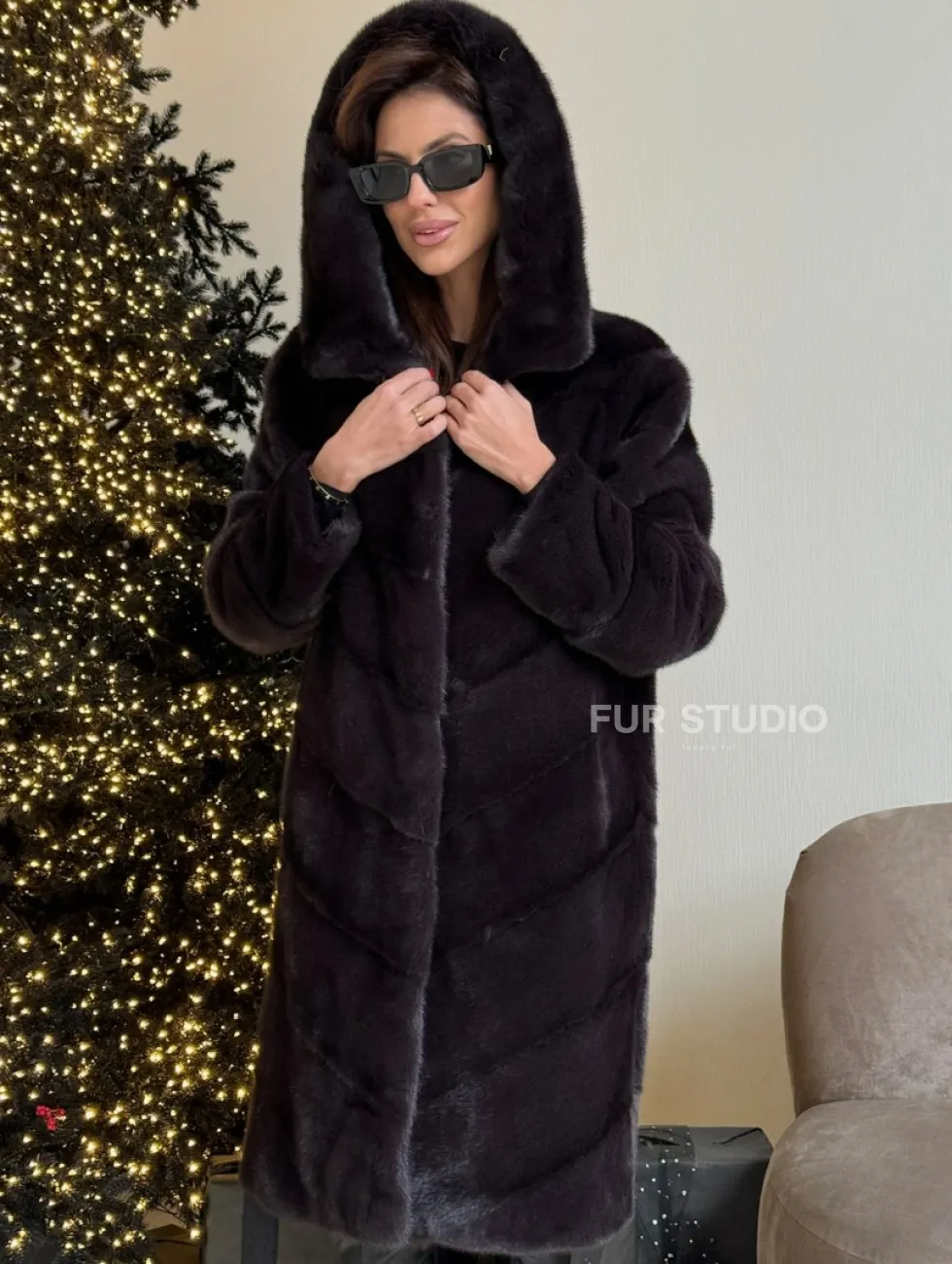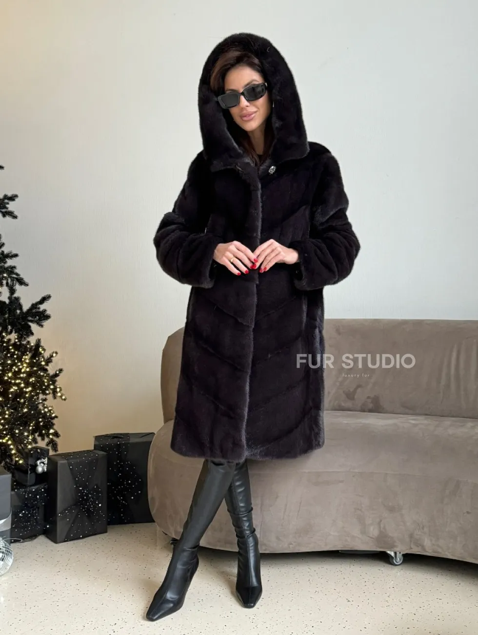 Норковая шуба с капюшоном, паркет - цвет инжир доступна для покупки в нашем шоуруме Furs Studio в Чите. У нас так же есть доставка во все города России. Добавьте немного роскоши в свой гардероб с этой шубой, которая будет служить вам многие годы.