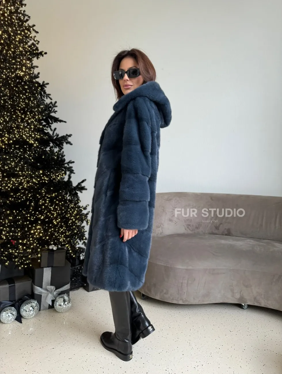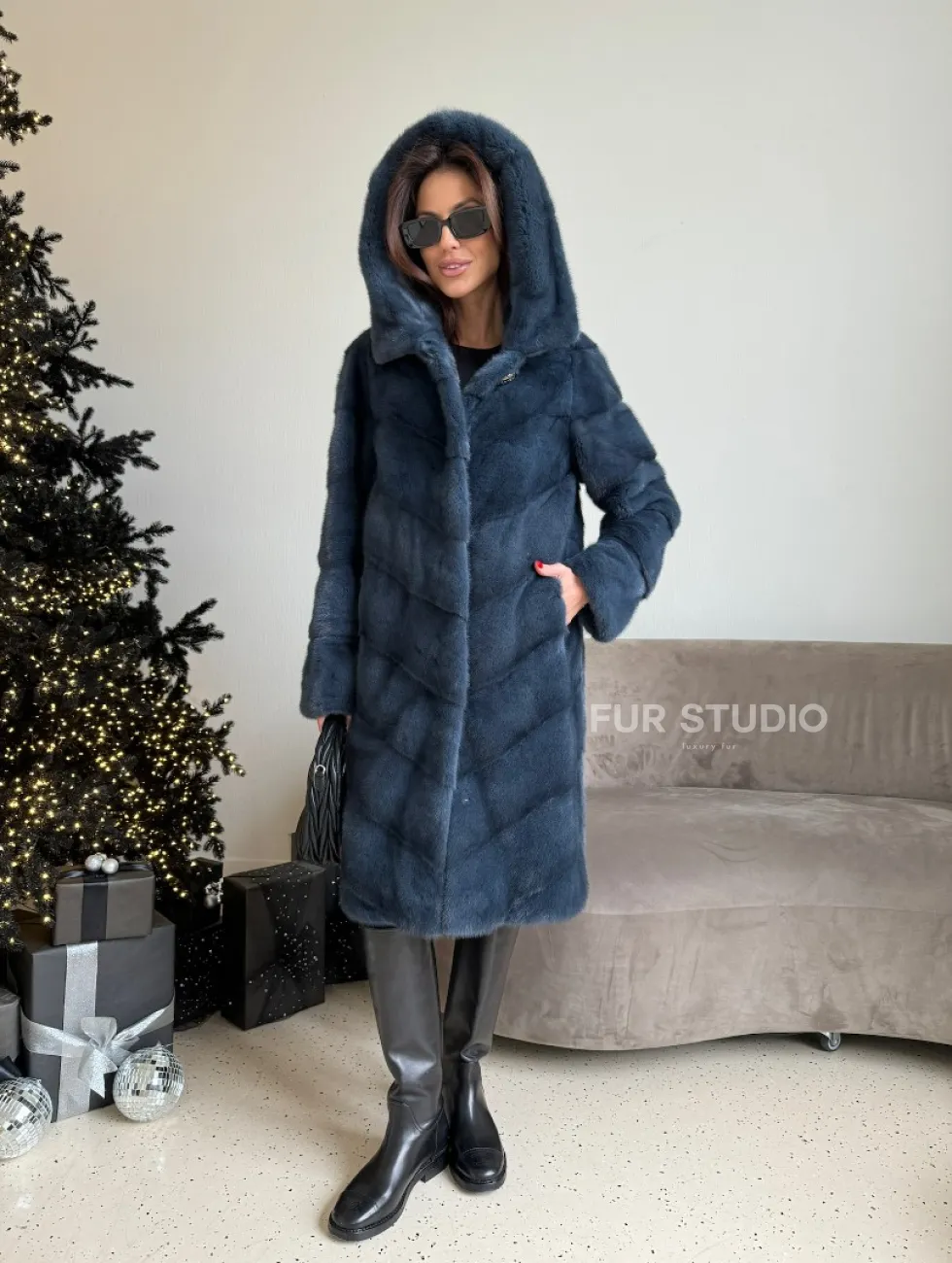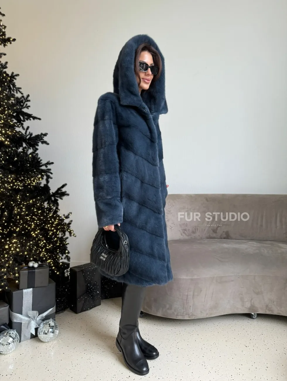 Норковая шуба с капюшоном, паркет - синего цвета доступна для покупки в нашем шоуруме Furs Studio в Чите. У нас так же есть доставка во все города России. Добавьте немного роскоши в свой гардероб с этой шубой, которая будет служить вам многие годы.
