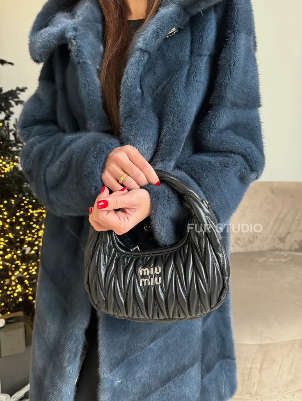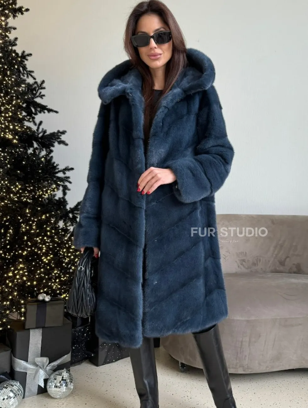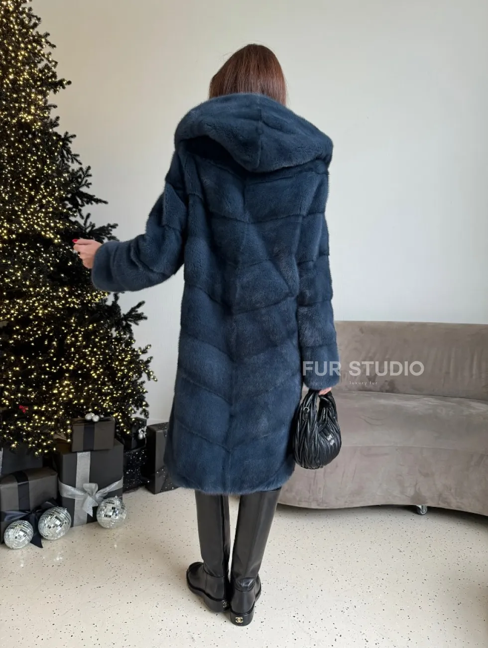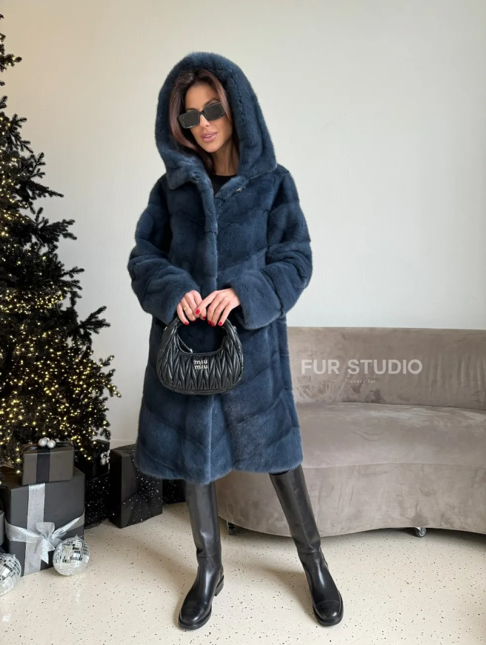 Норковая шуба с капюшоном, паркет - синего цвета доступна для покупки в нашем шоуруме Furs Studio в Чите. У нас так же есть доставка во все города России. Добавьте немного роскоши в свой гардероб с этой шубой, которая будет служить вам многие годы.