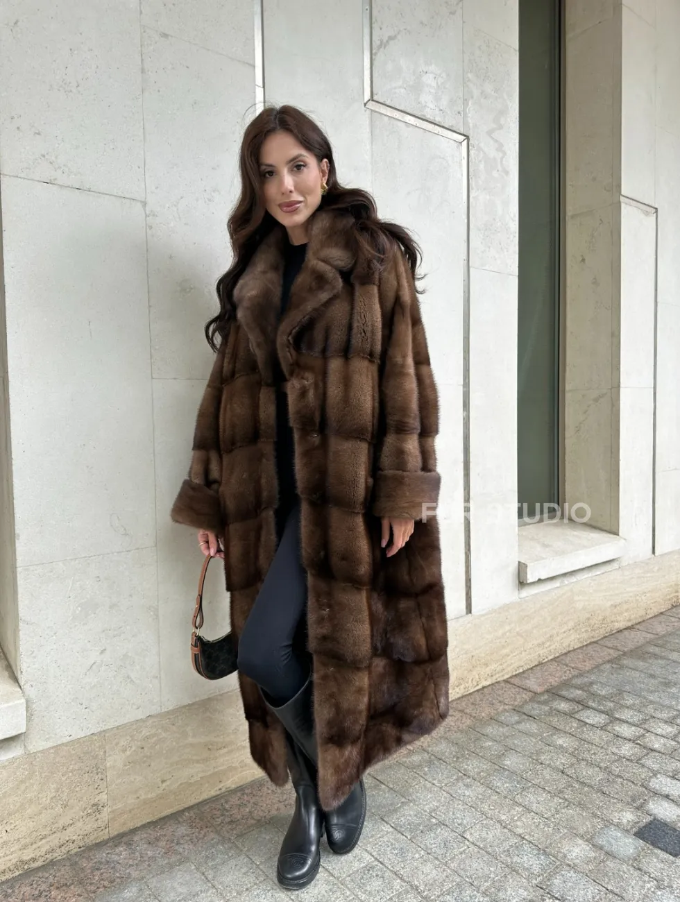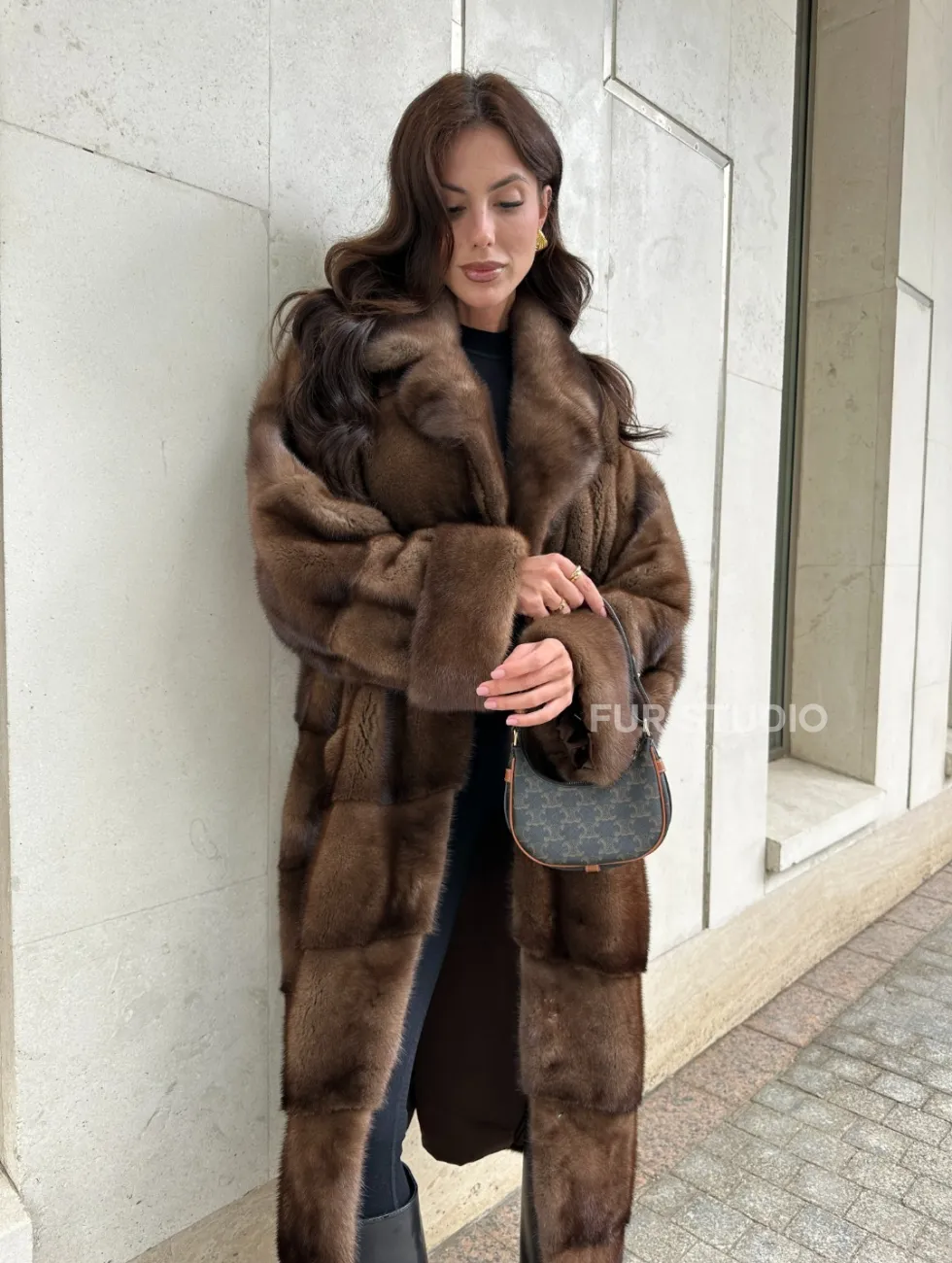 Мех данной шубы аукционная норка, цвет коричневый. Предлагается в размерах от 42 до 64. Длина модели 115-120 см, что выгодно подчеркивает фигуру девушек. Эта модель идеально подойдет для девушек и женщин, предпочитающих роскошные натуральные меха.