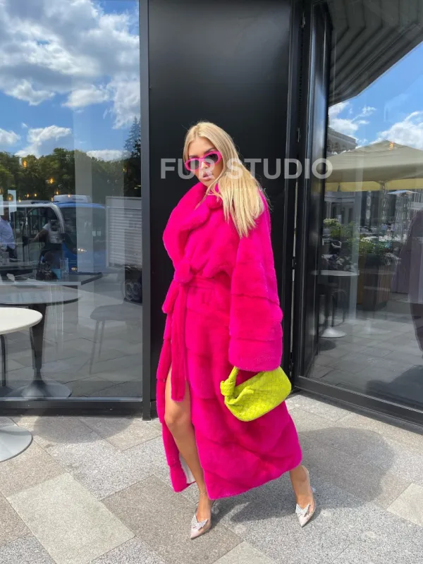 Меховой пояс выгодно очертит талию, подчеркивая ее изящество. Удобный воротник сделает акцент на изгибах шеи. Широкие манжеты подчеркивают тонкость кистей. Добавьте в образ оригинальную сумочку, и вы будете выглядеть великолепно. Купить норковую шубу в цвете фуксия могут позволить девушки, которые любят экспериментировать и удивлять.