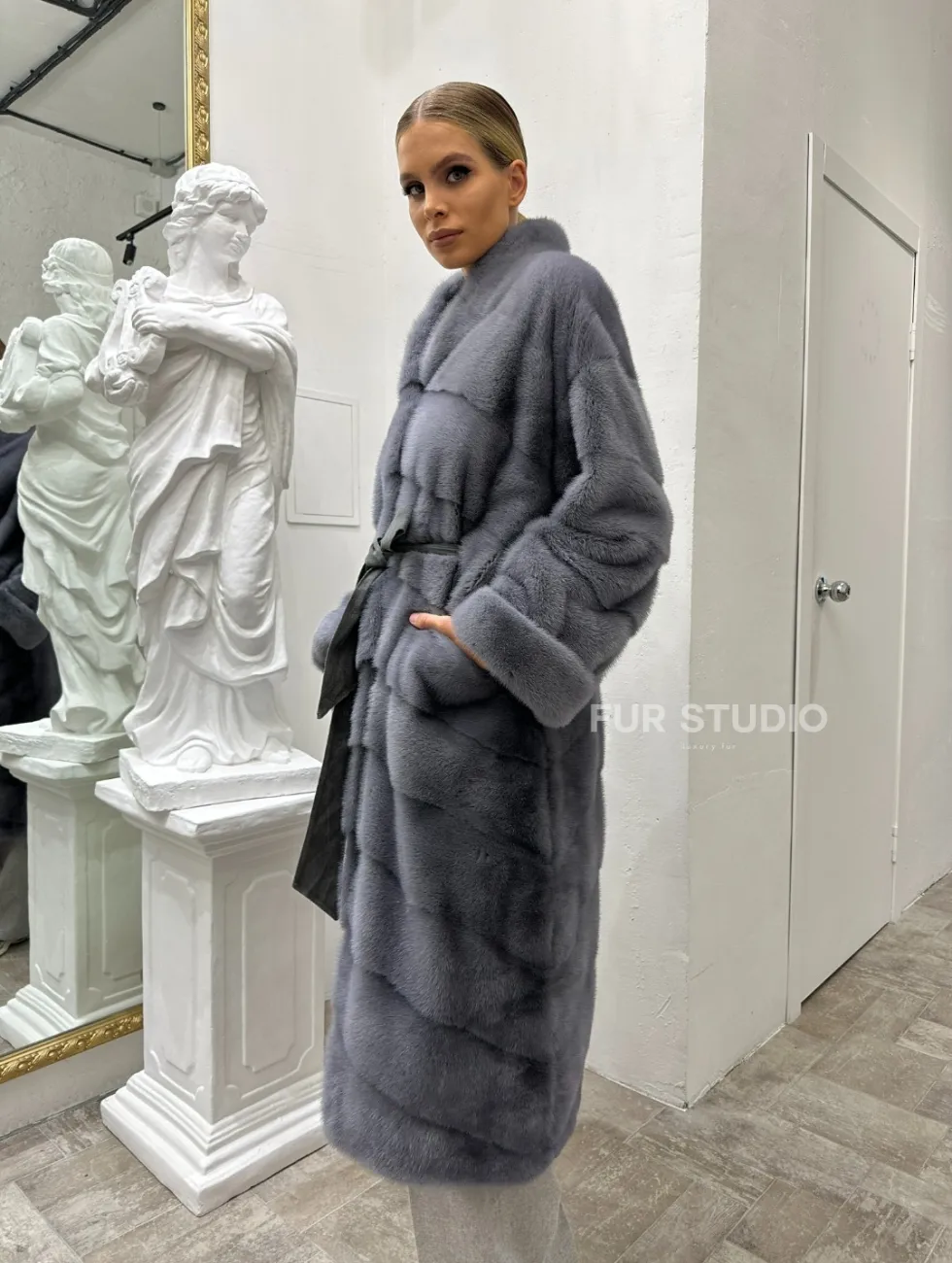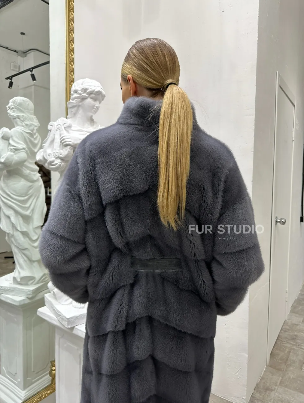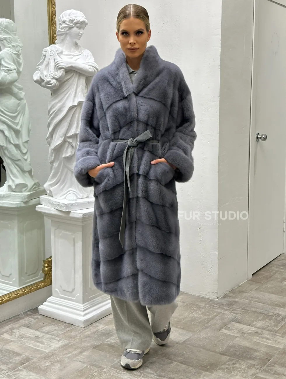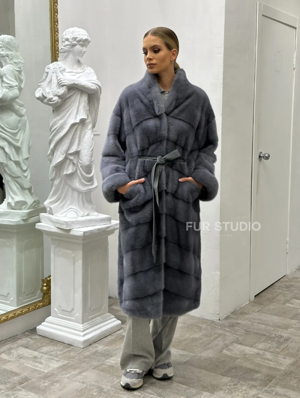 Мех данной шубы аукционная норка, цвет серый. Предлагается в размерах от 42 до 48. Длина модели 115-120 см, что выгодно подчеркивает фигуру девушек. Эта модель идеально подойдет для девушек и женщин, предпочитающих роскошные натуральные меха.