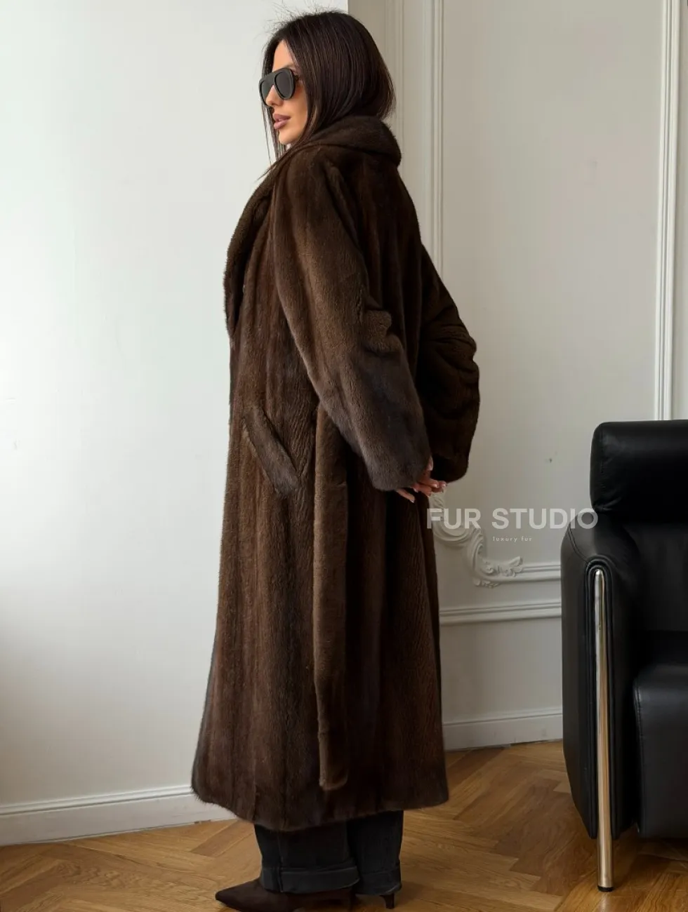 Мех данной шубы аукционная норка , цвет коричневый. Предлагается в размерах от 42 до 52. Длина модели 115-120 см, что выгодно подчеркивает фигуру девушек. Эта модель идеально подойдет для девушек и женщин, предпочитающих роскошные натуральные меха.