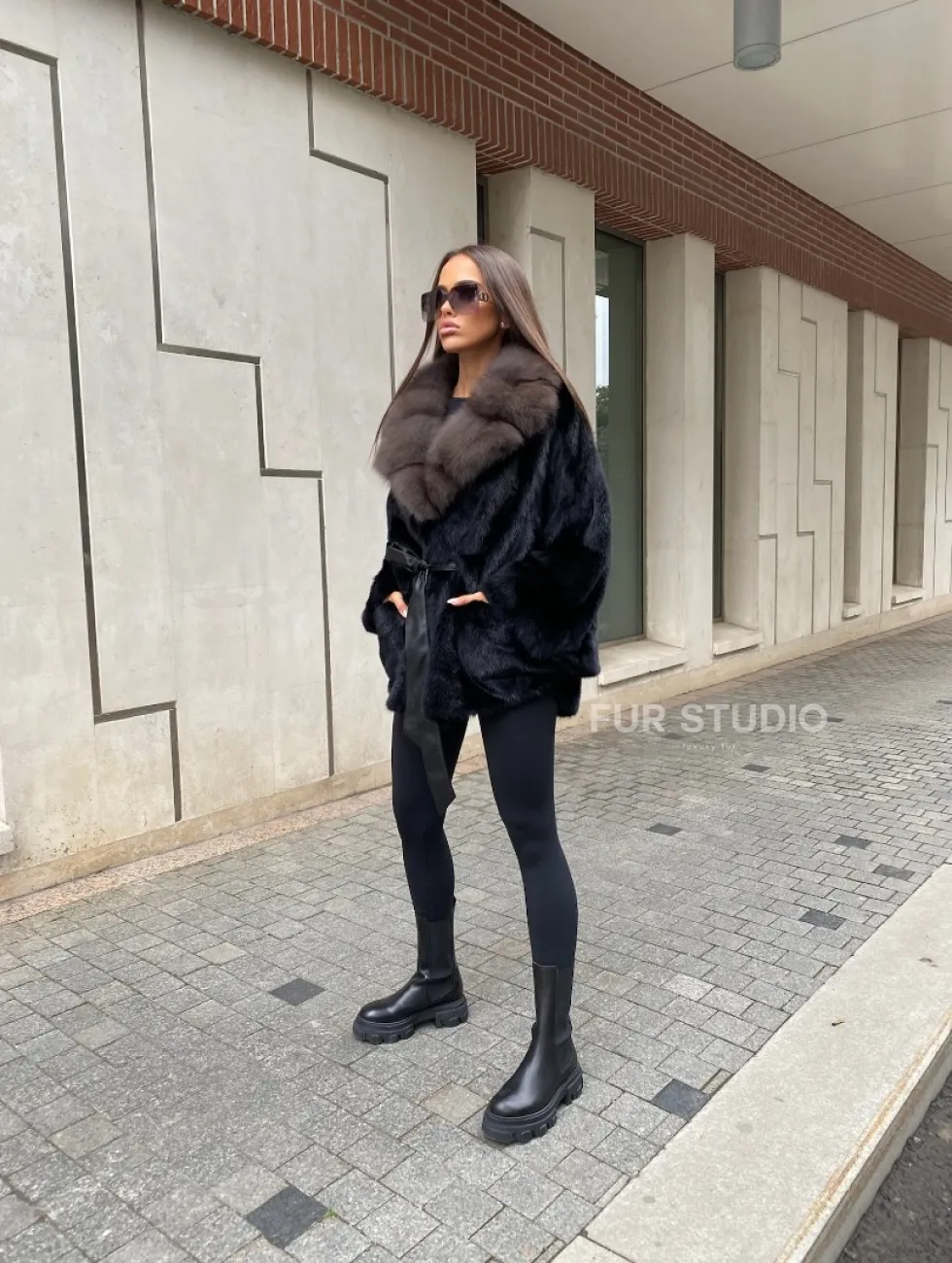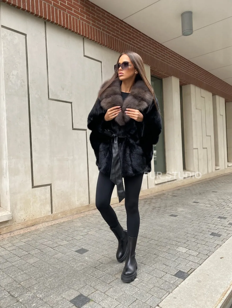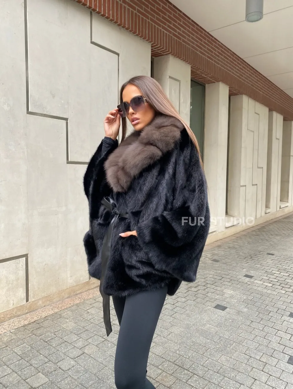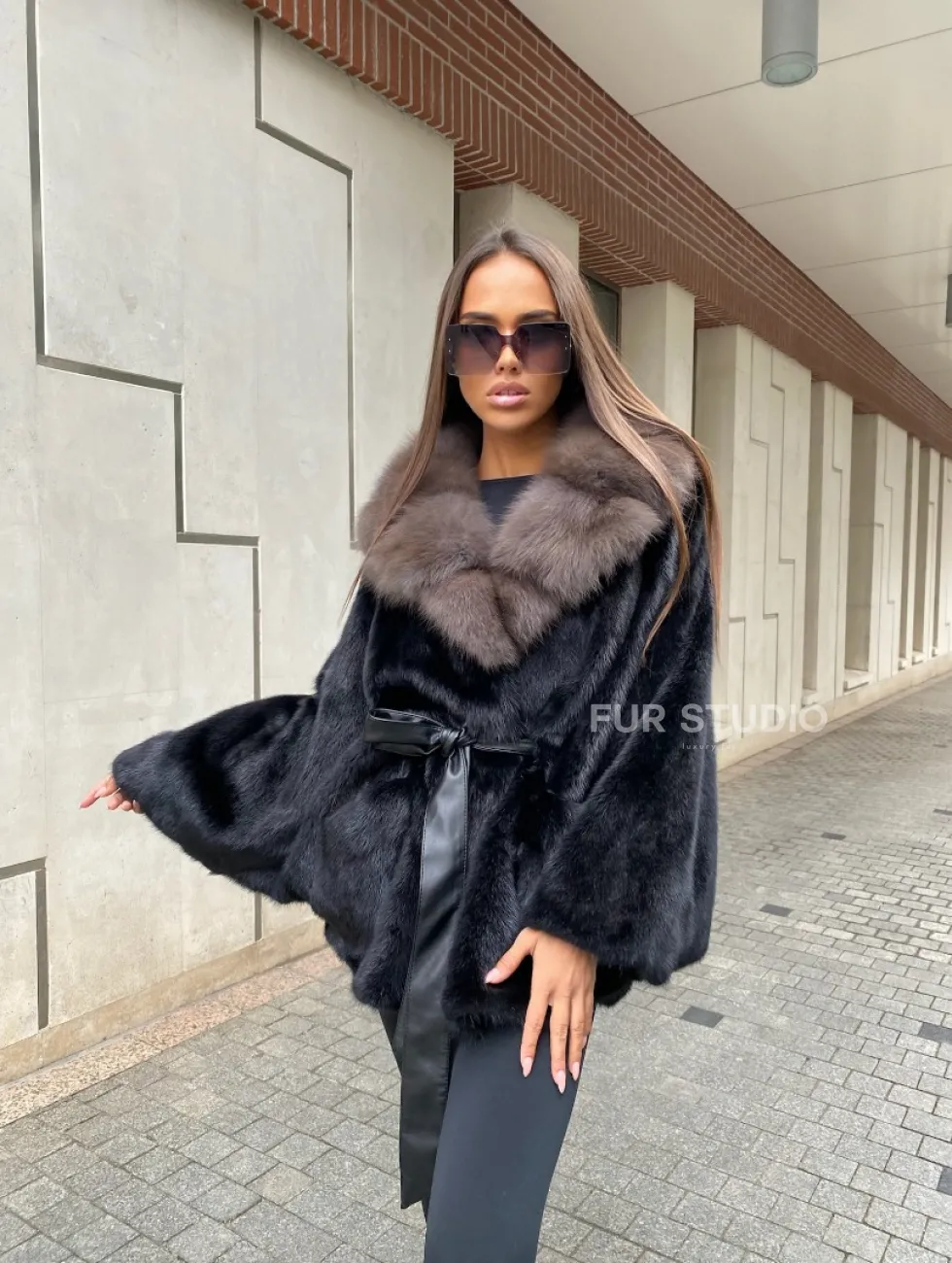 Норковое пончо с воротником из меха куницы в черном цвете – отличная альтернатива шуб для современных модниц. Пончо не сковывает движения и прекрасно подходит для тех девушек, кто водит машину. Необычный пояс подчеркнет изящество талии. Свободный крой выгодно скроет недостатки фигуры. Прекрасный выбор для девушек любого возраста.