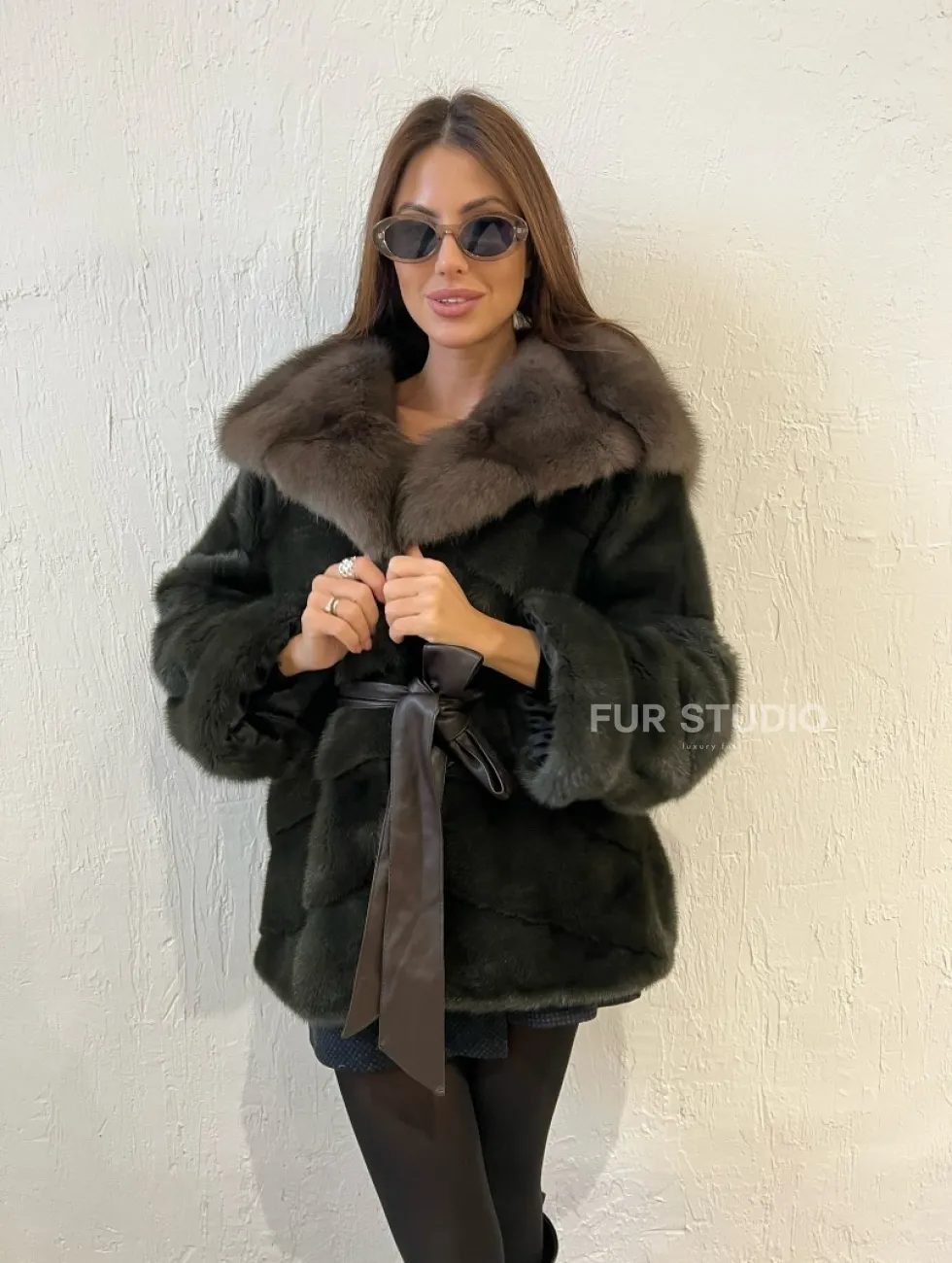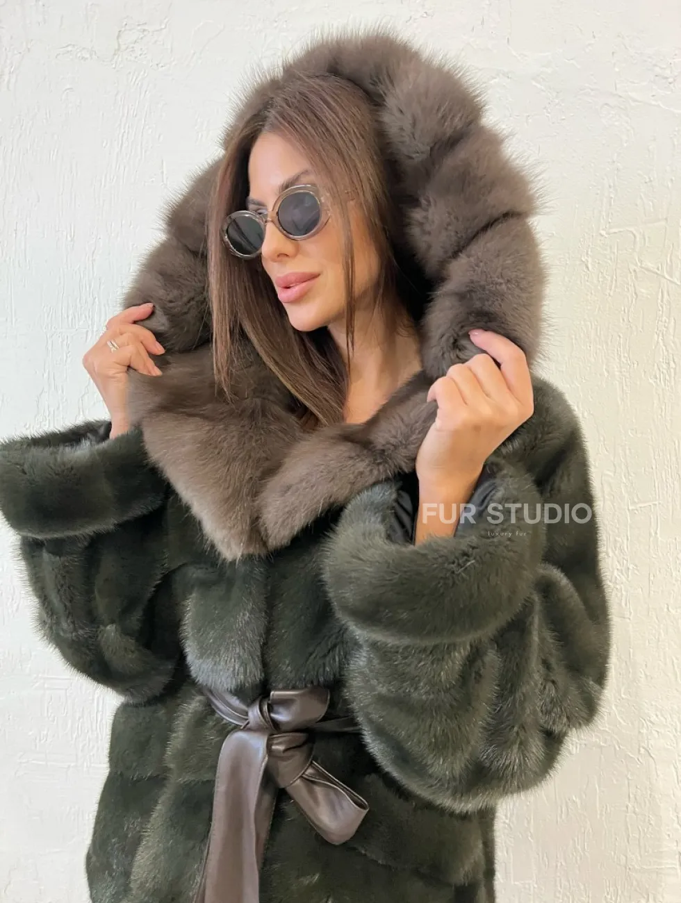 Широкие манжеты выгодно подчеркнут изящность ручек. А удобные карманы согреют их в прохладную погоду. Широкий размерный ряд дает возможность купить верхнюю одежду девушкам любого типа фигуры и размера. Купить норковое пончо шубу с капюшоном из меха куницы - цвет оливковый могут лишь девушки с изысканным вкусом.