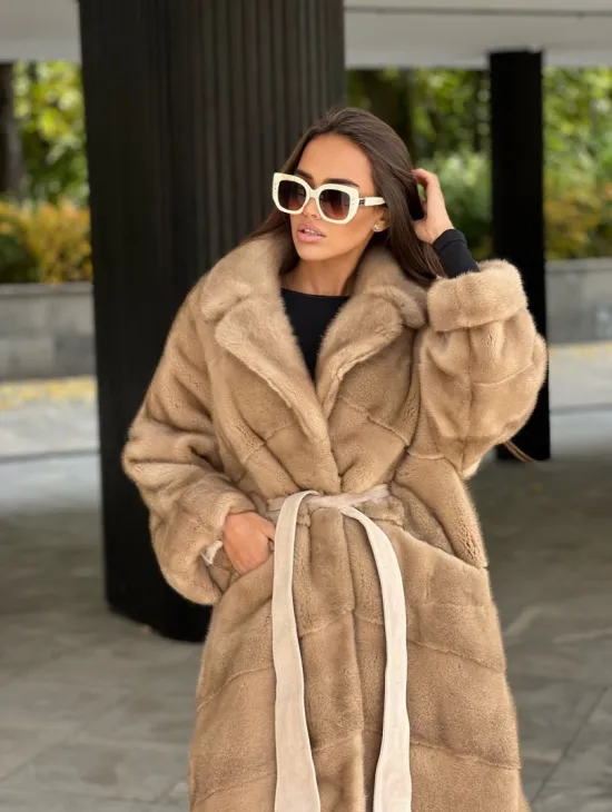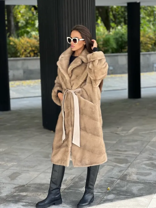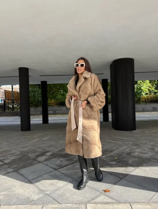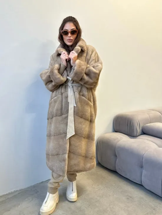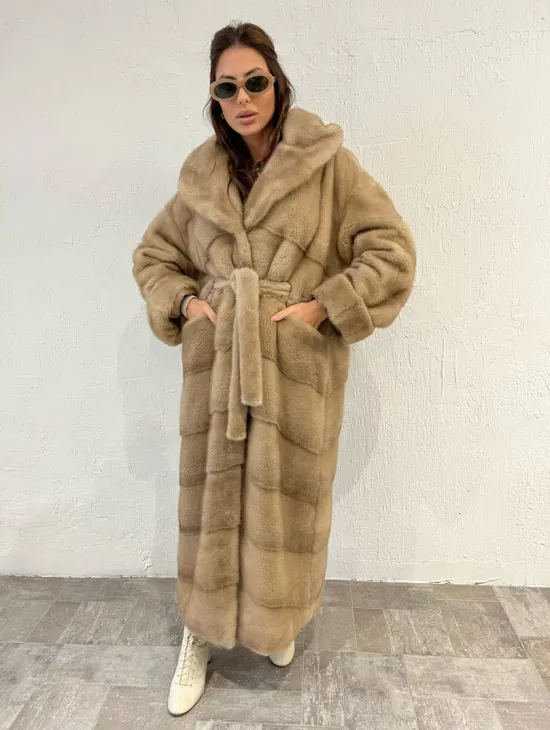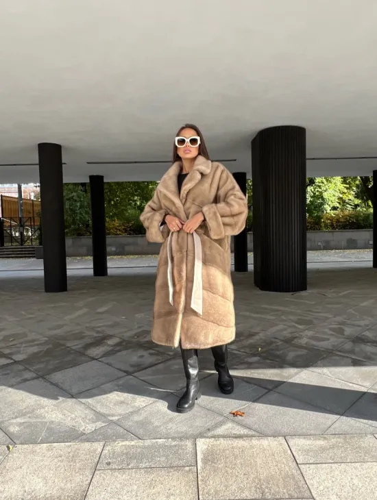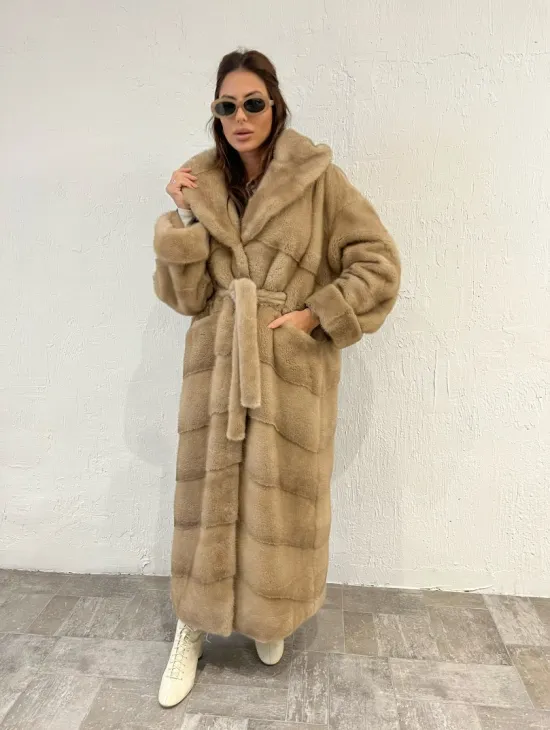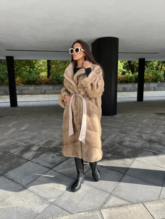 Мех данной шубы аукционная норка, цвет бежевый. Предлагается в размерах от 48 до 52. Длина модели 95-100 см, что выгодно подчеркивает фигуру девушек. Эта модель идеально подойдет для девушек и женщин, предпочитающих роскошные натуральные меха.