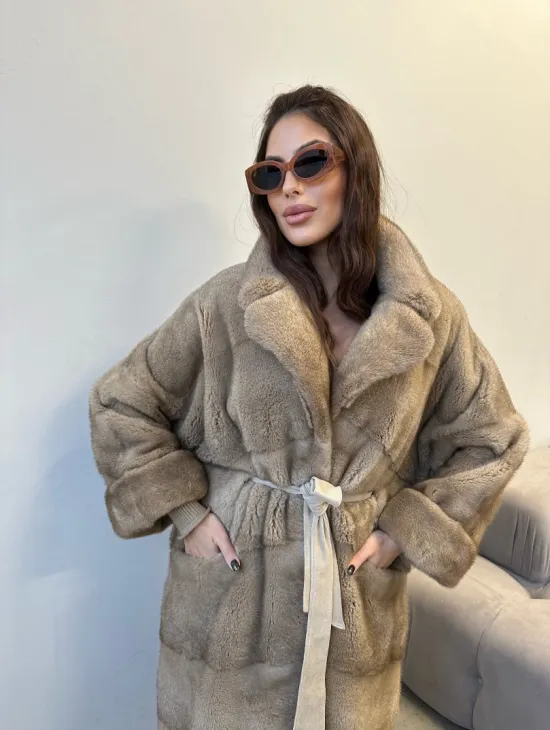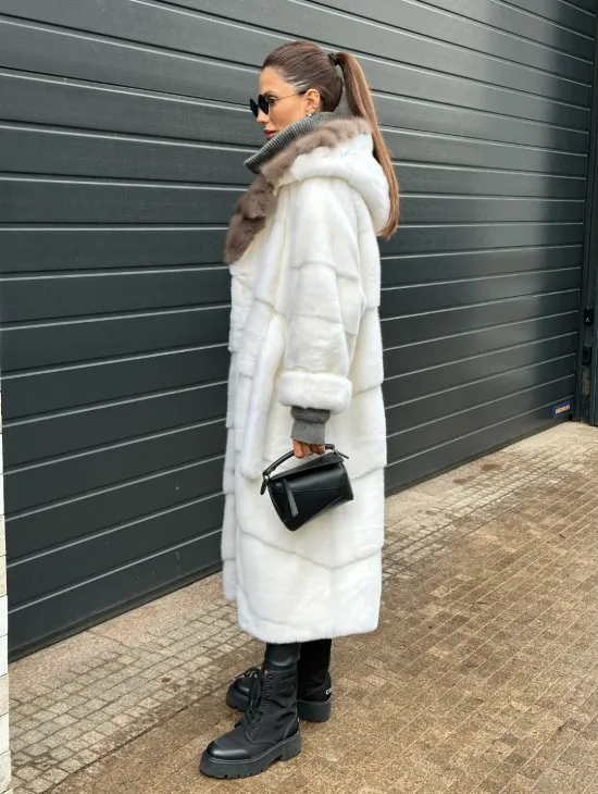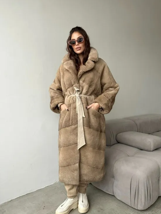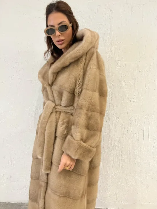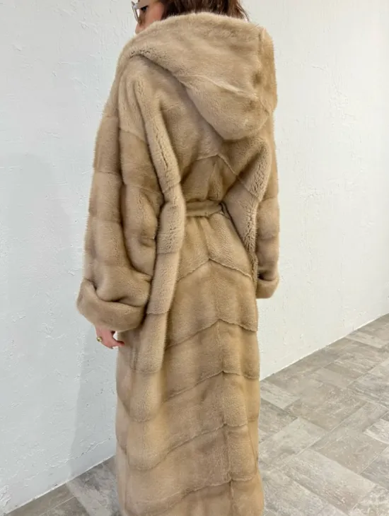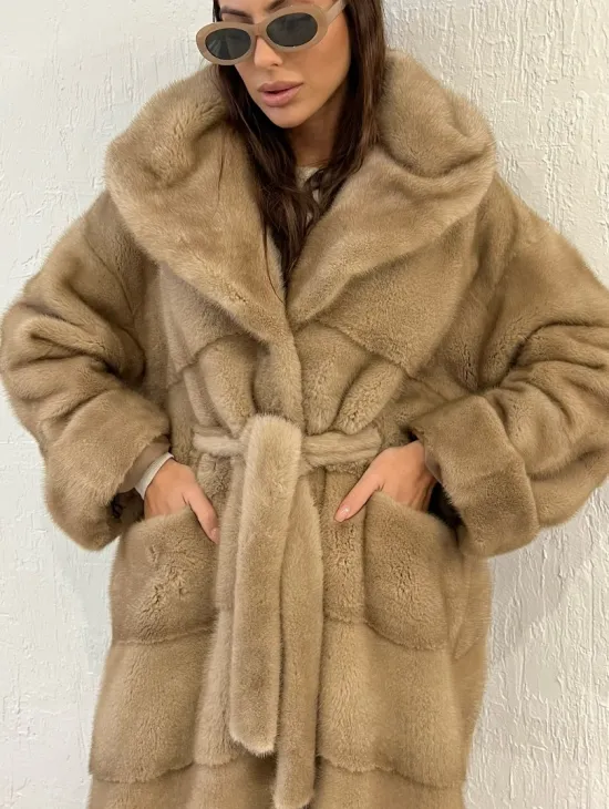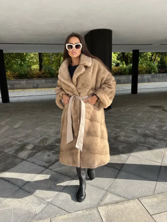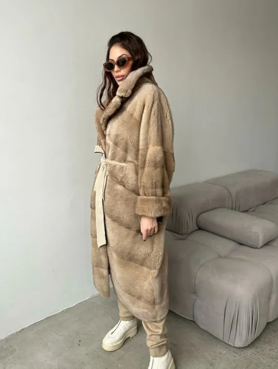 Мех данной шубы аукционная норка, цвет бежевый. Предлагается в размерах от 48 до 52. Длина модели 95-100 см, что выгодно подчеркивает фигуру девушек. Эта модель идеально подойдет для девушек и женщин, предпочитающих роскошные натуральные меха.