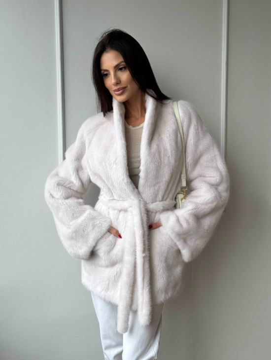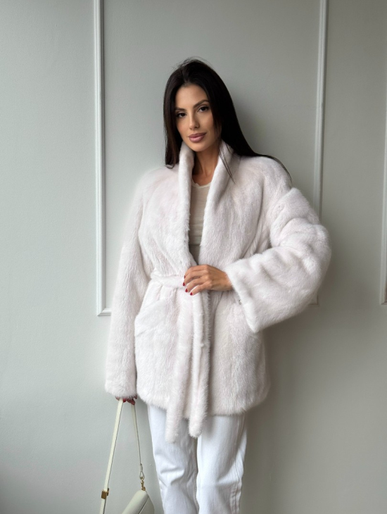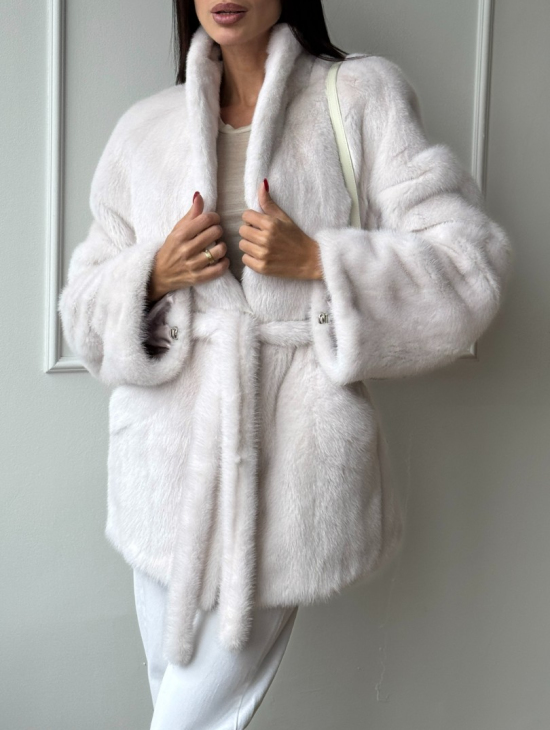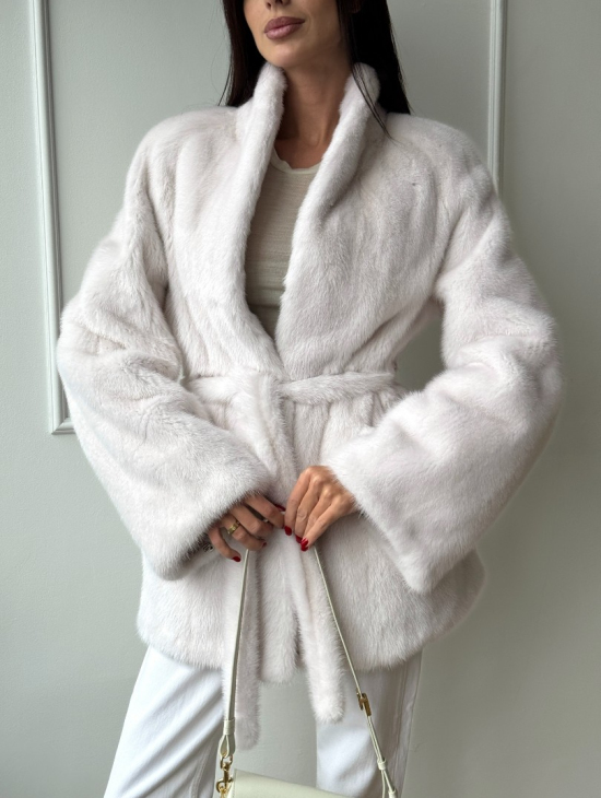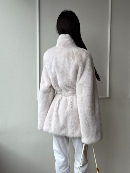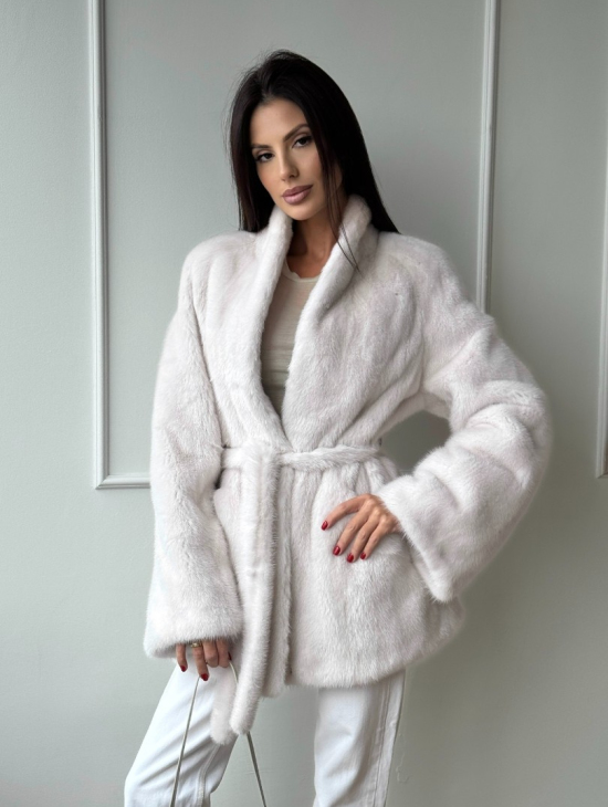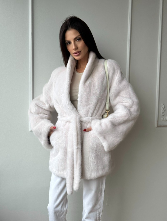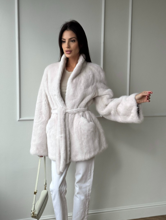 Белый меховой жакет из норки с V-образным воротником и поясом