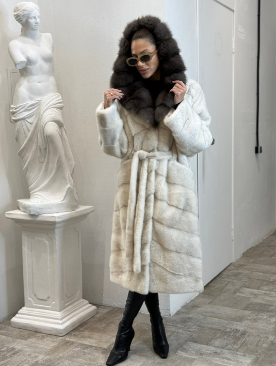 Шуба норковая с капюшоном из меха куницы - цвет жемчуг