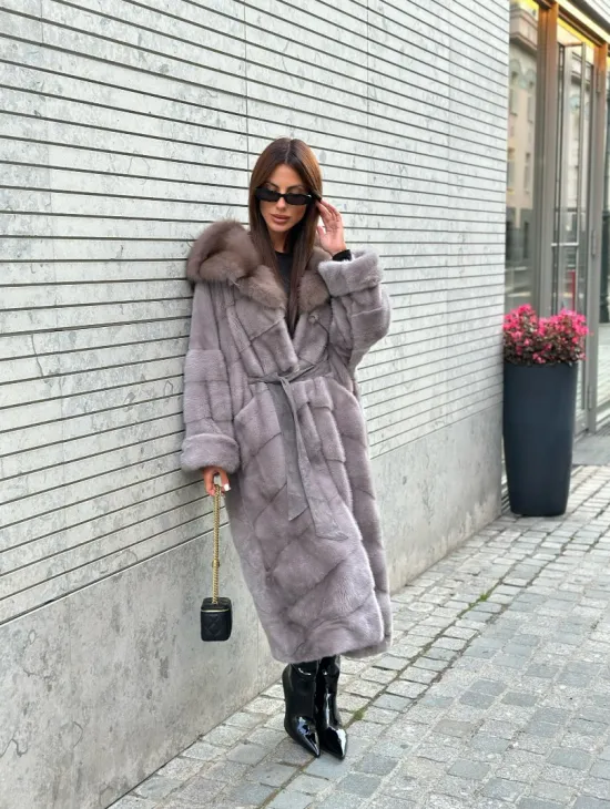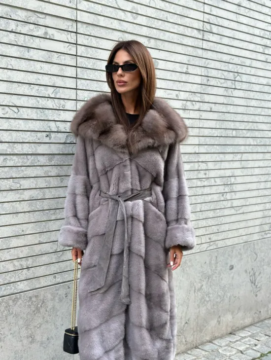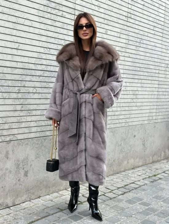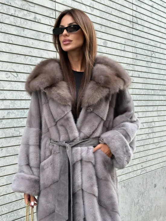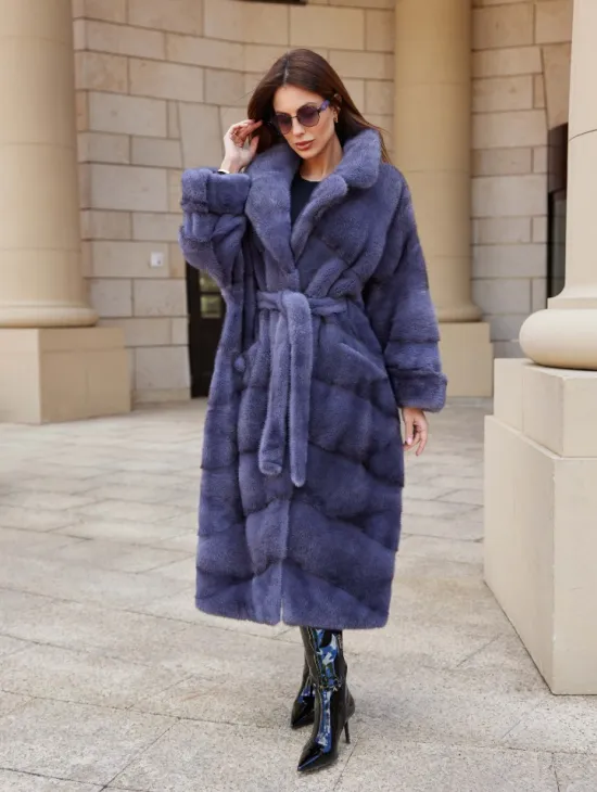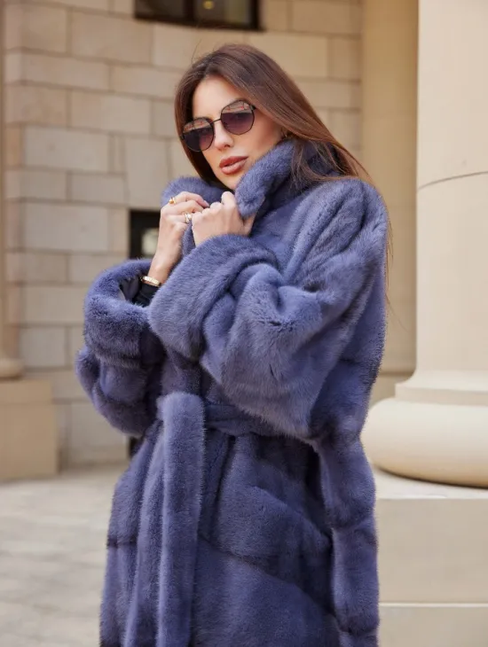 Роскошная норковая шуба с воротником из меха куницы в цвете индиго
