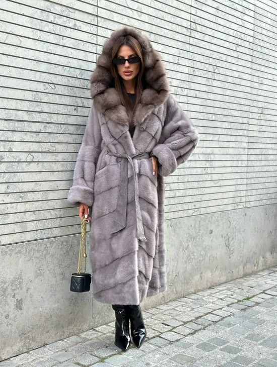 Роскошная норковая шуба с капюшоном из меха куницы - цвет королевский синий