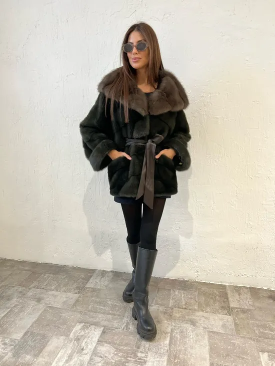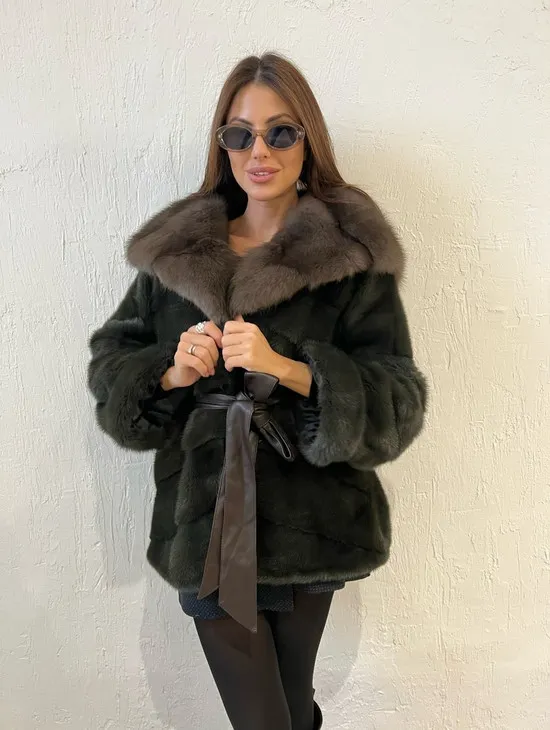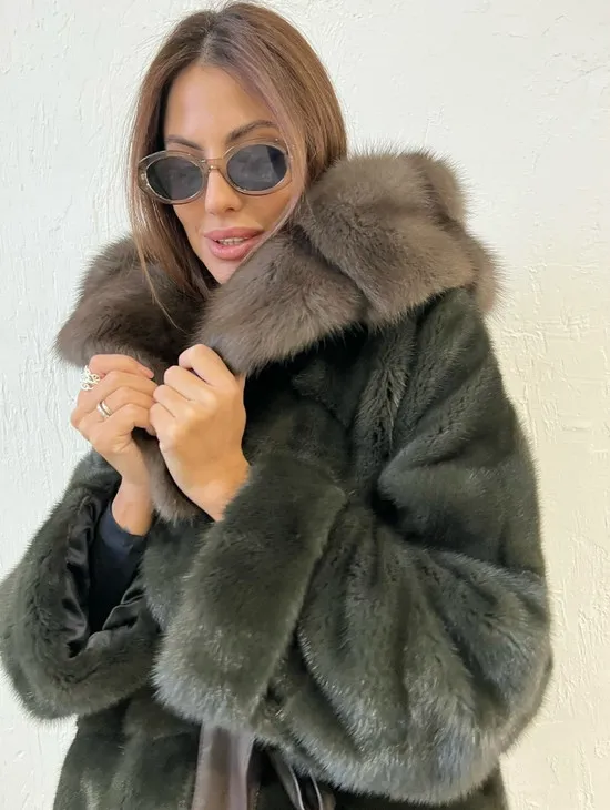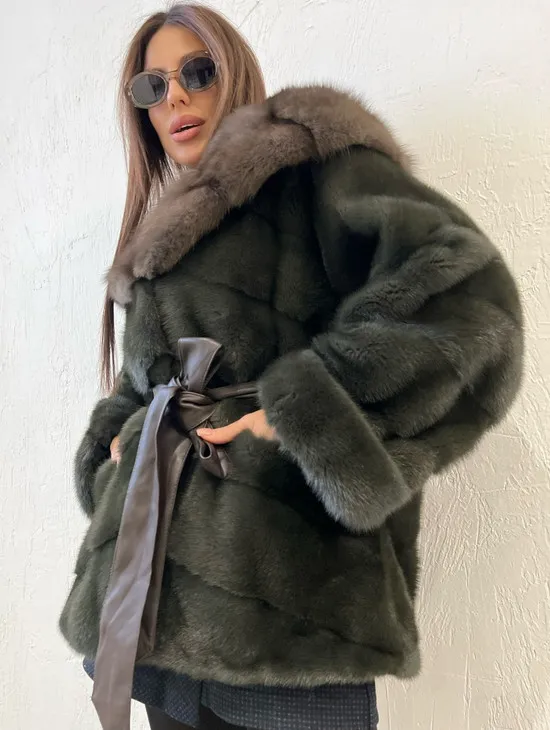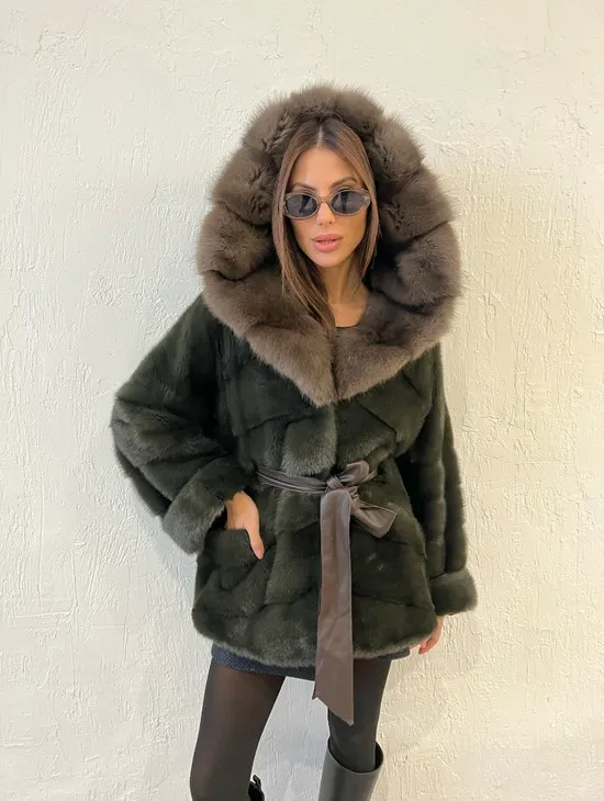 Норковое пончо шуба с капюшоном из меха куницы - цвет оливковый