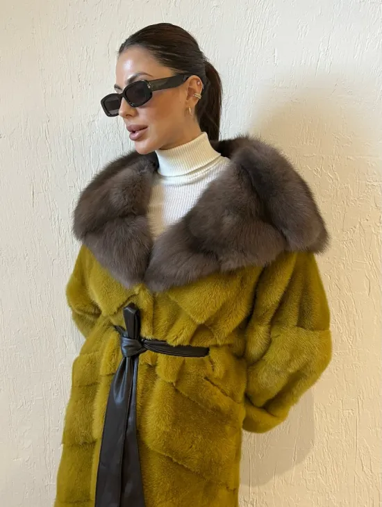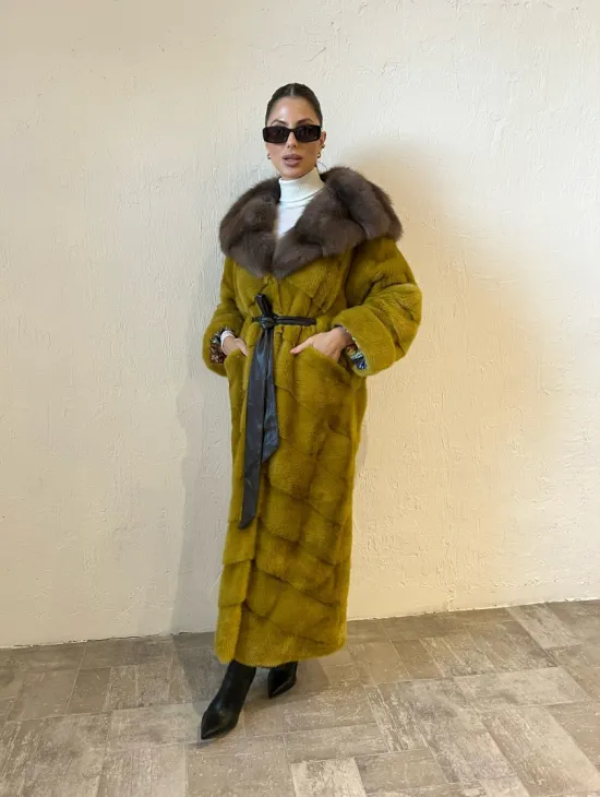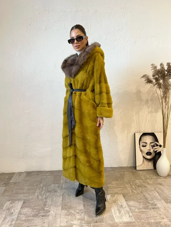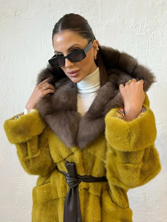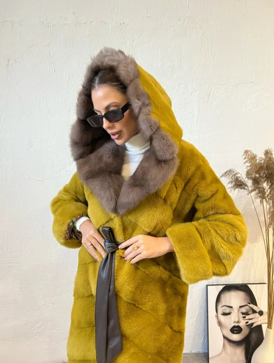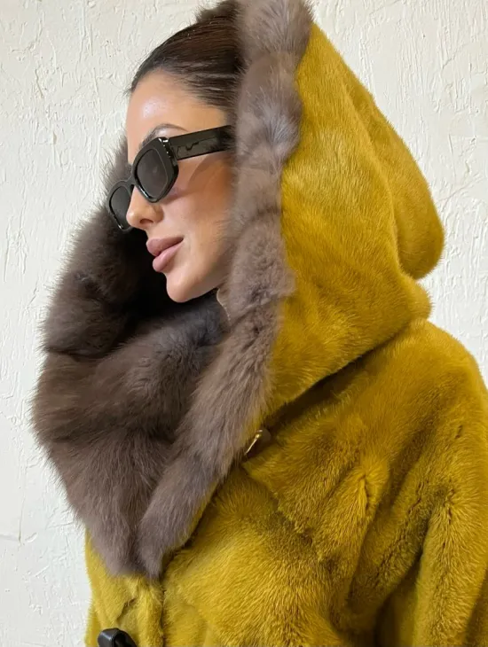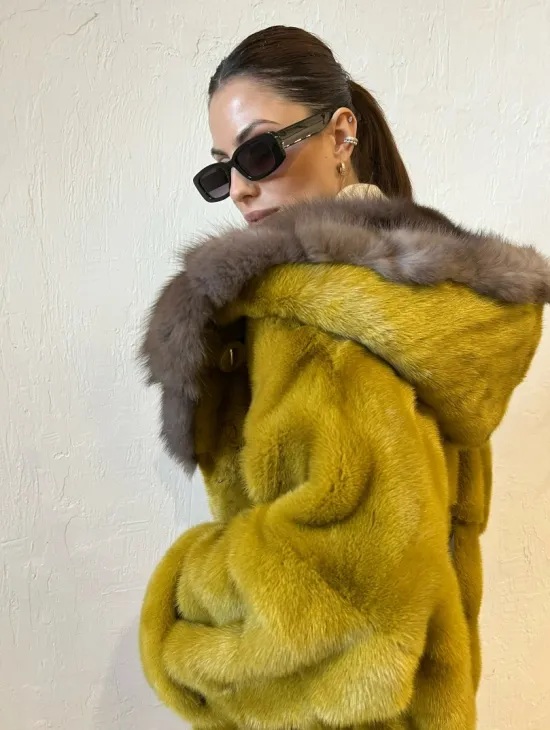 Шуба норковая с капюшоном из меха рыси в лимонном цвете