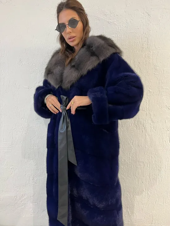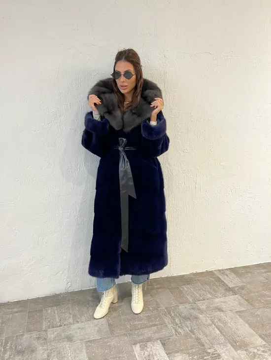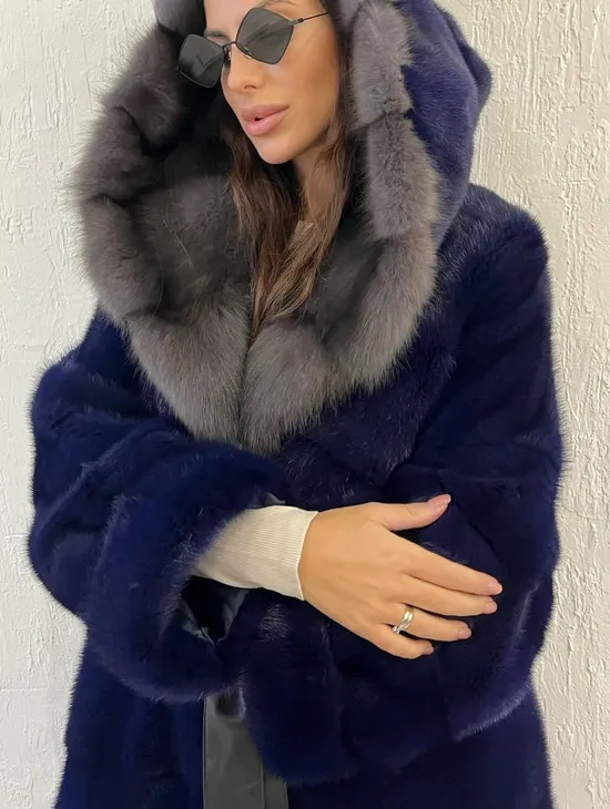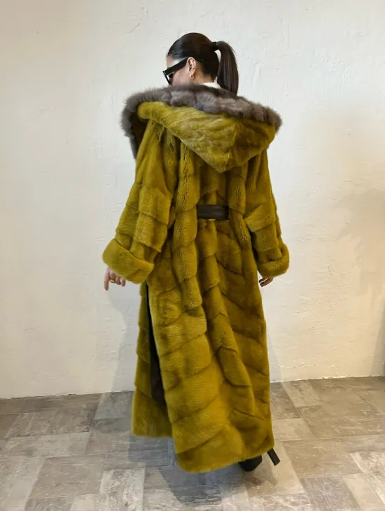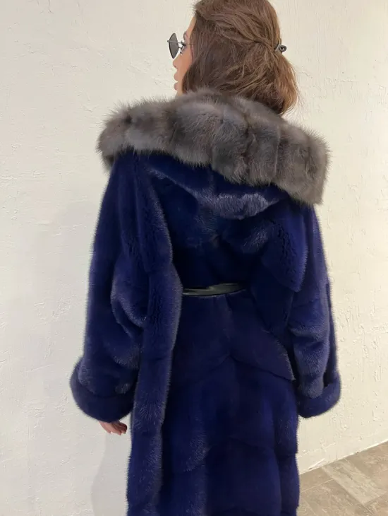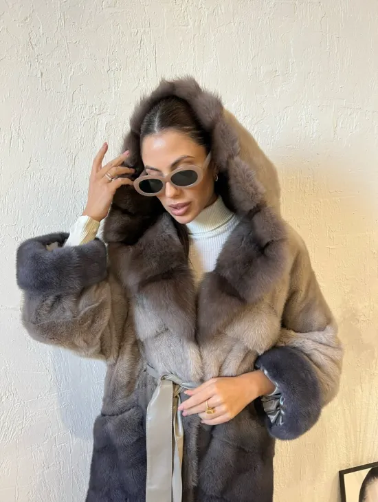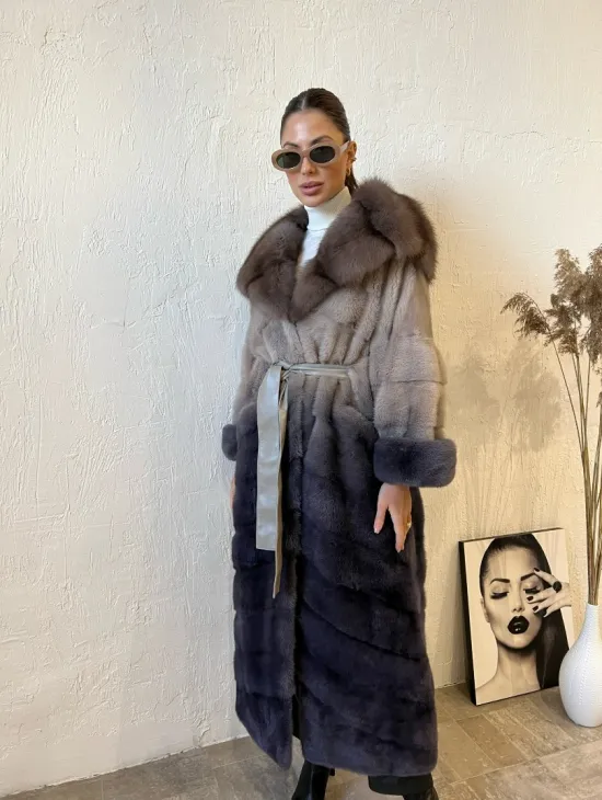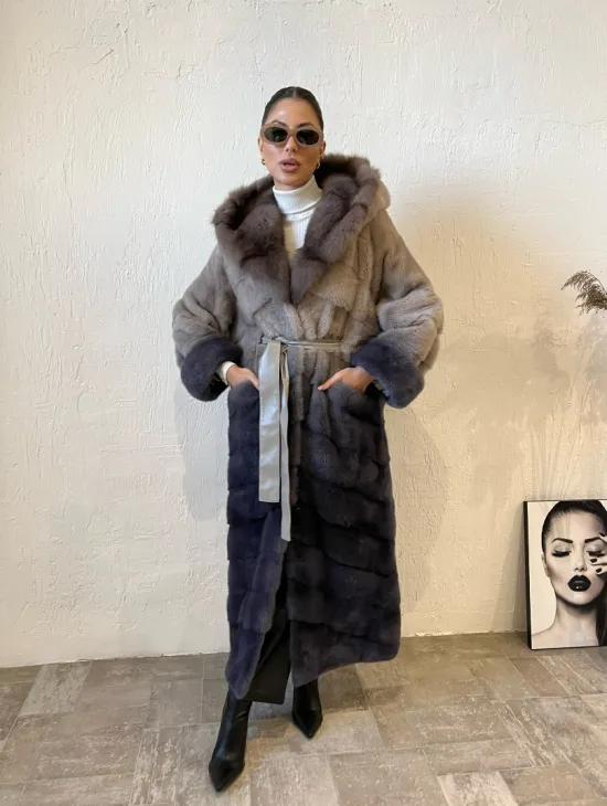 Удлиненная норковая шуба с капюшоном из меха куницы - эффект деграде