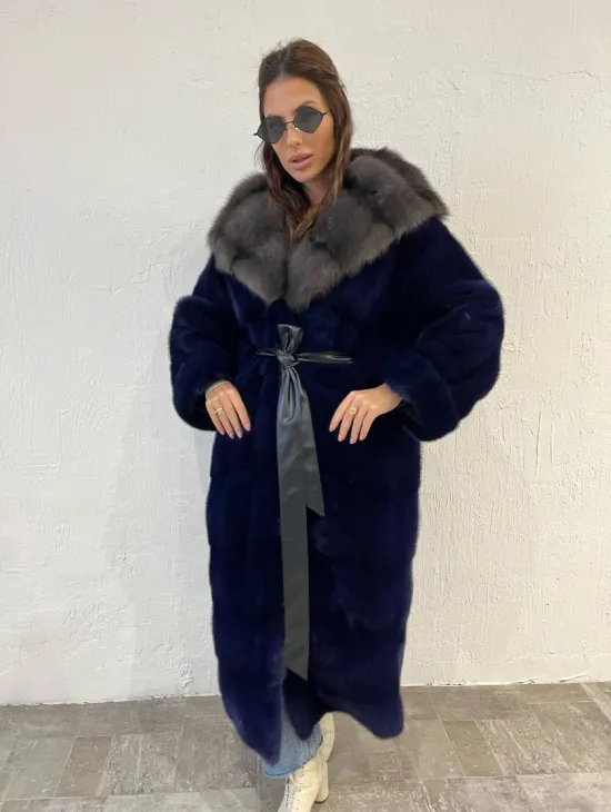 Удлиненная норковая шуба с капюшоном куница - цвет соболь