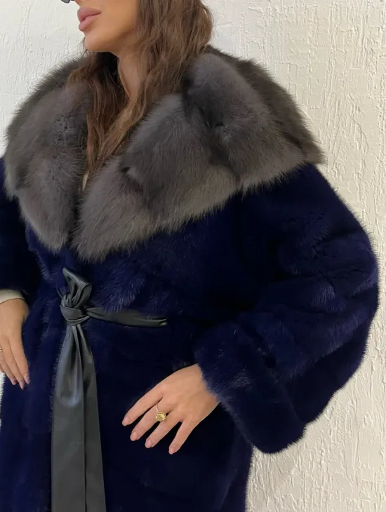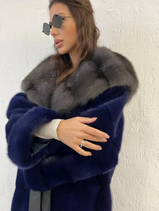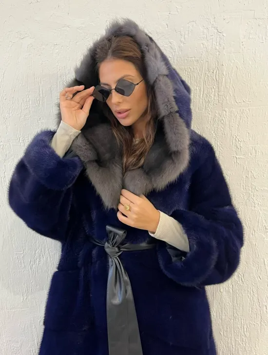 Шуба из меха норки с капюшоном куница - цвет электрик