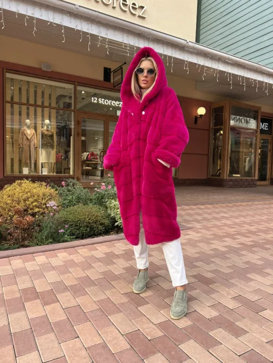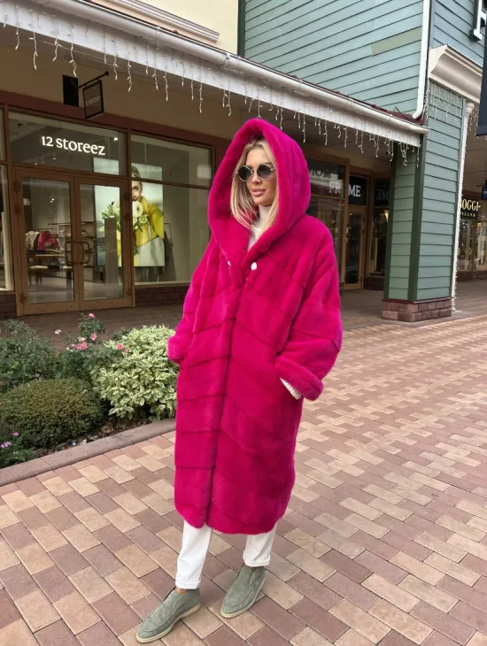Шуба из скандинавской норки с капюшоном в розовом цвете