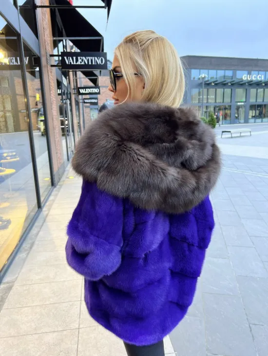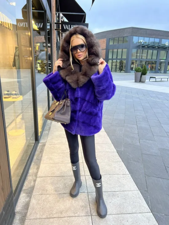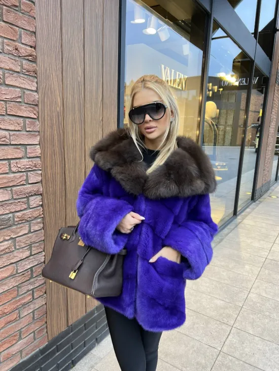 Шуба норковая с капюшоном из меха куницы - цвет фиолетовый