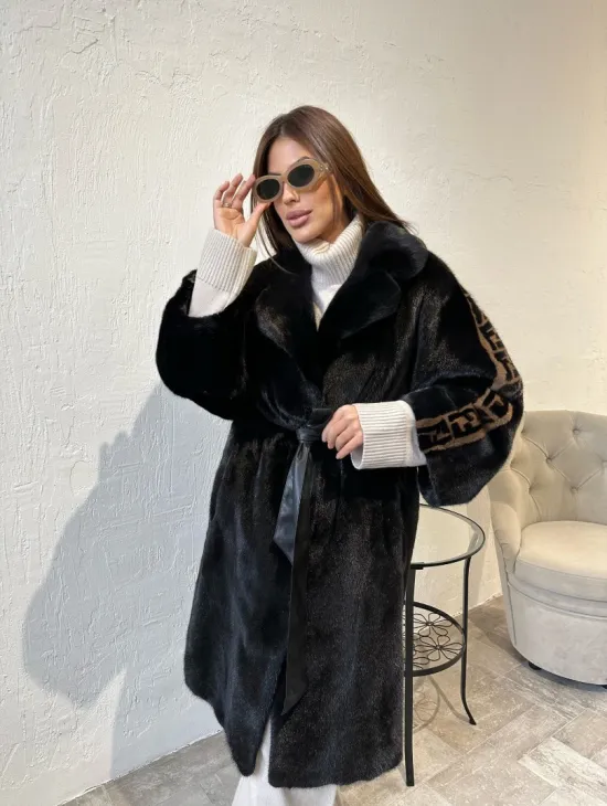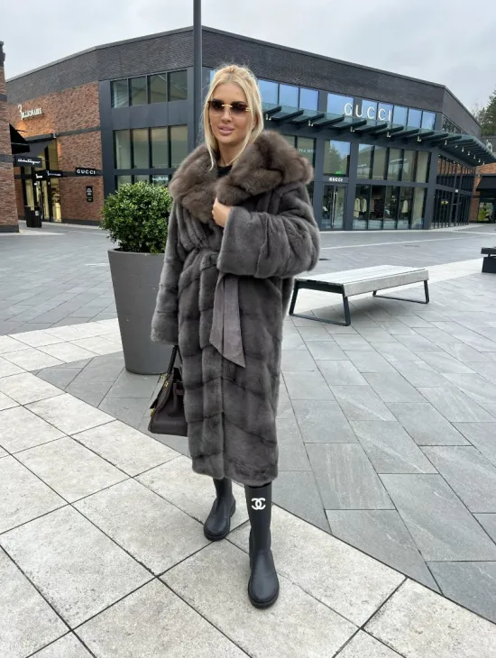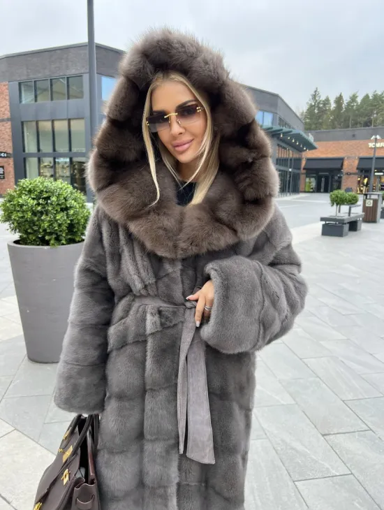Шуба норковая с капюшоном из меха куницы в цвете графит грей