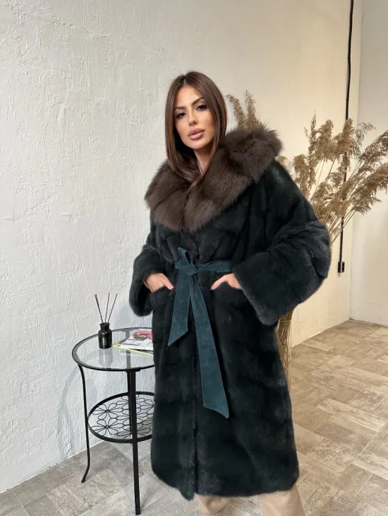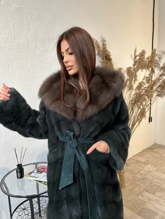 Шуба норковая с капюшоном из меха куницы в цвете малахит