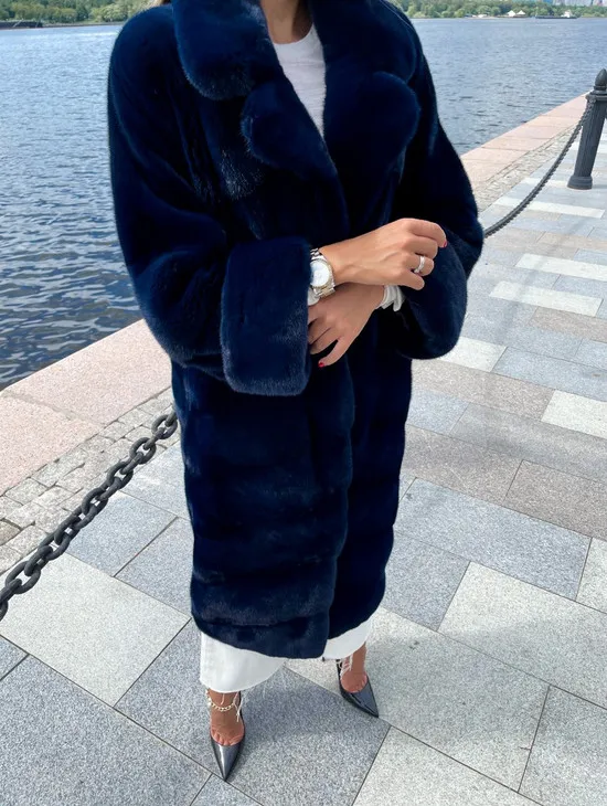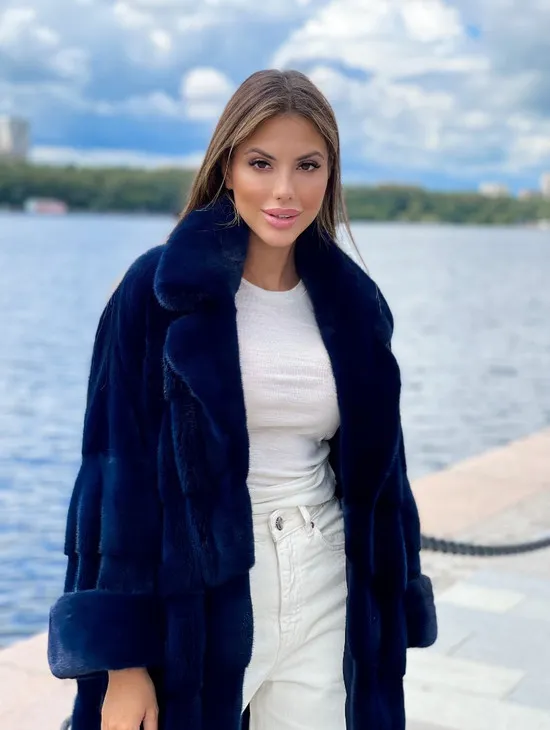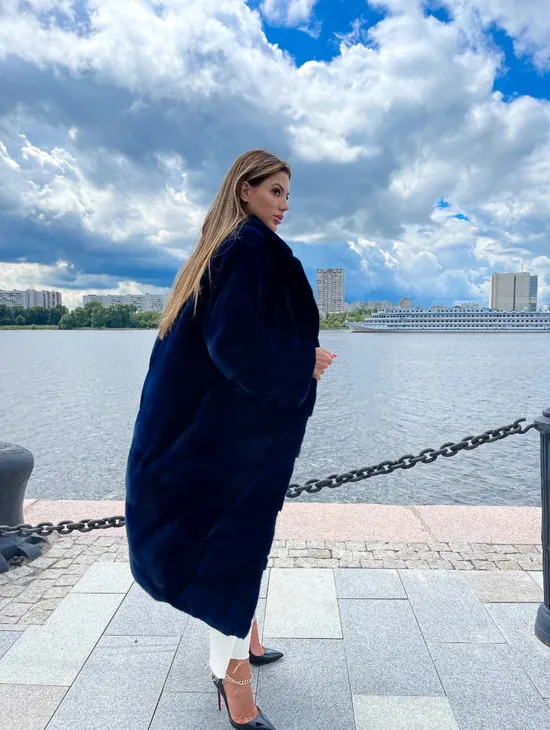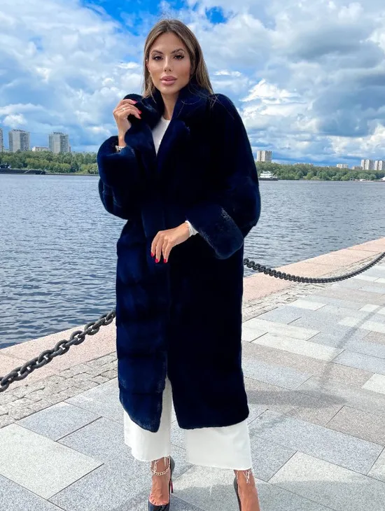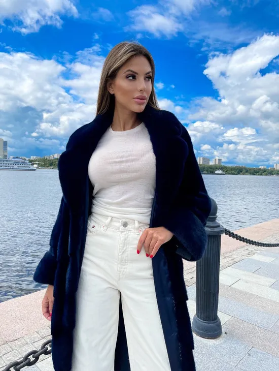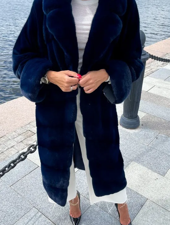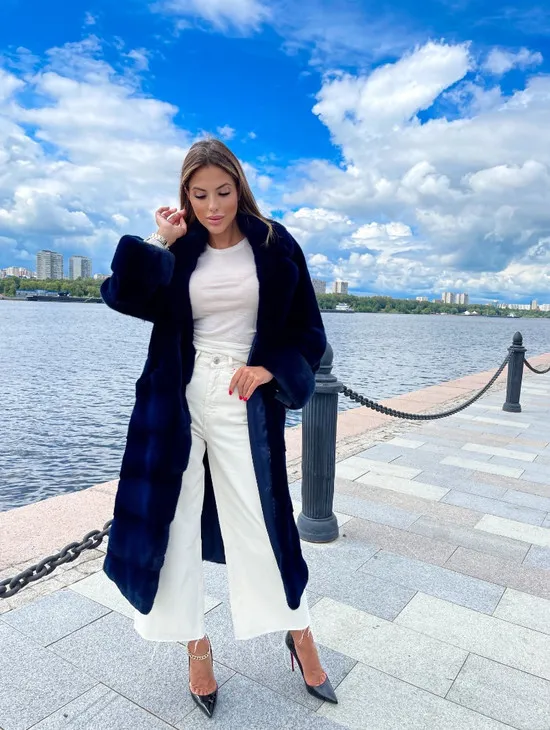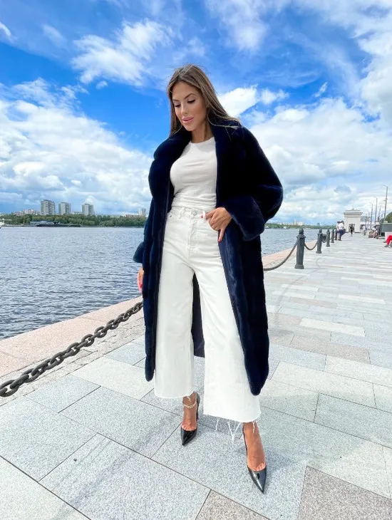 Длинная норковая шуба в белом цвете с воротником из куницы