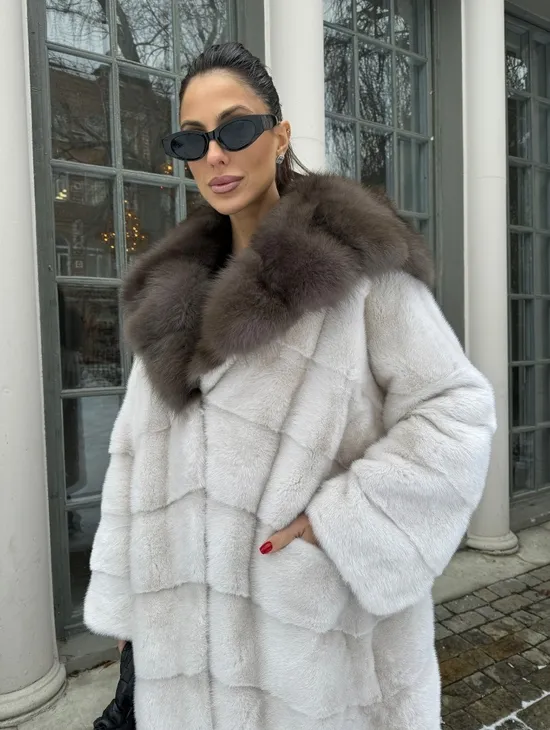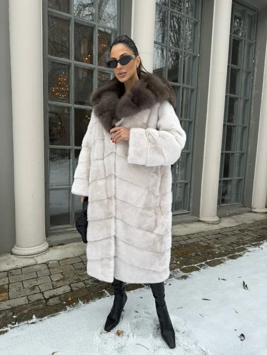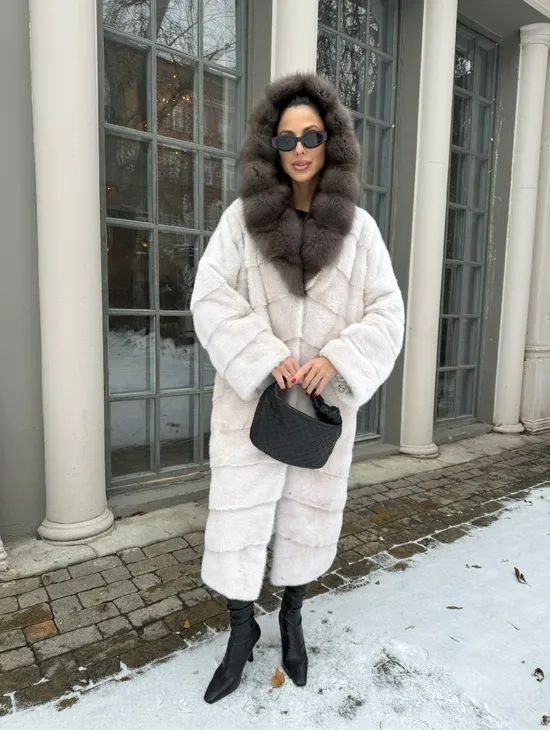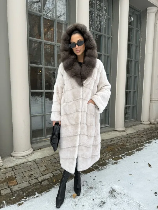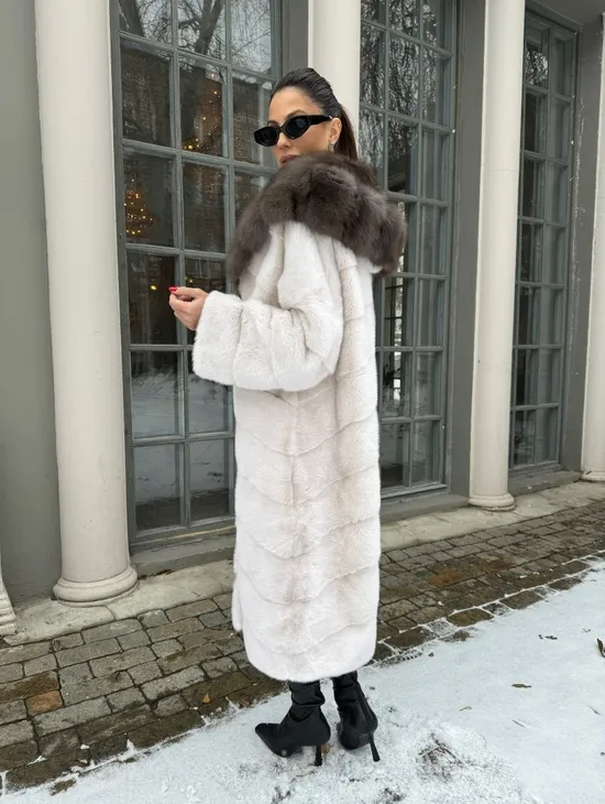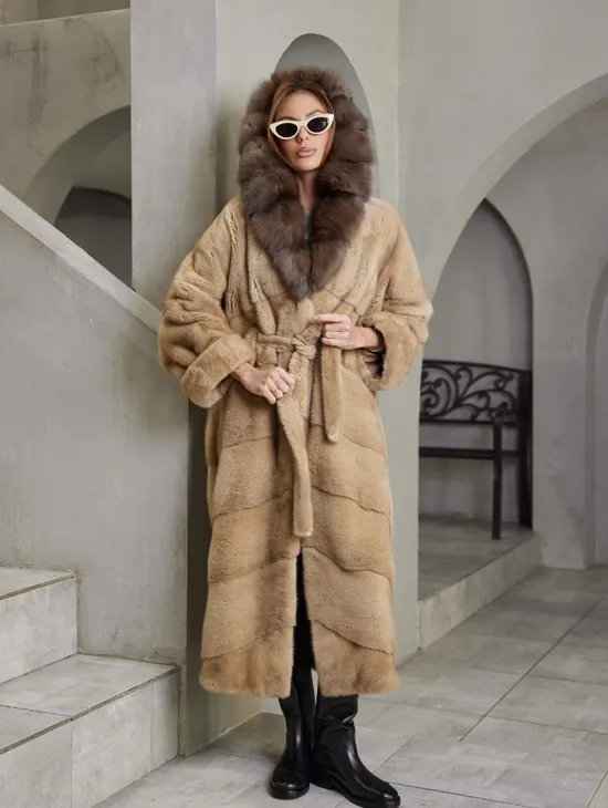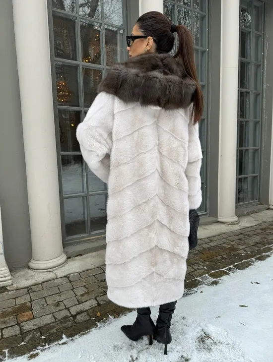 Норковое кимоно с капюшоном из меха куницы - цвет жемчуг