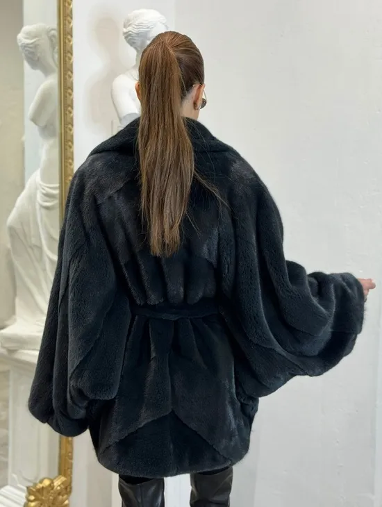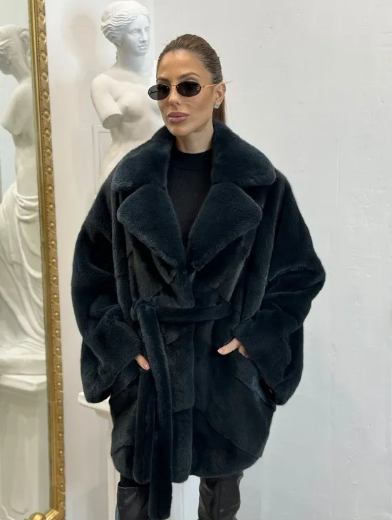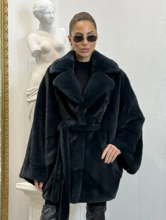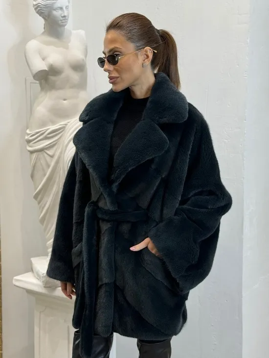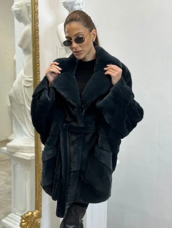 Шуба летучая мышь английский воротник, паркет мех NAFA - цвет черный изумруд