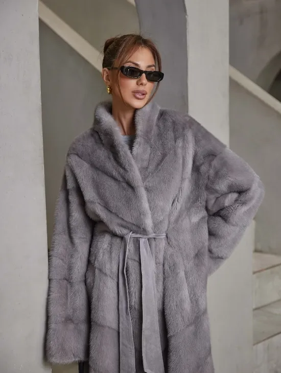 Стильная норковая шуба воротник отворот - цвет дымчато-серый