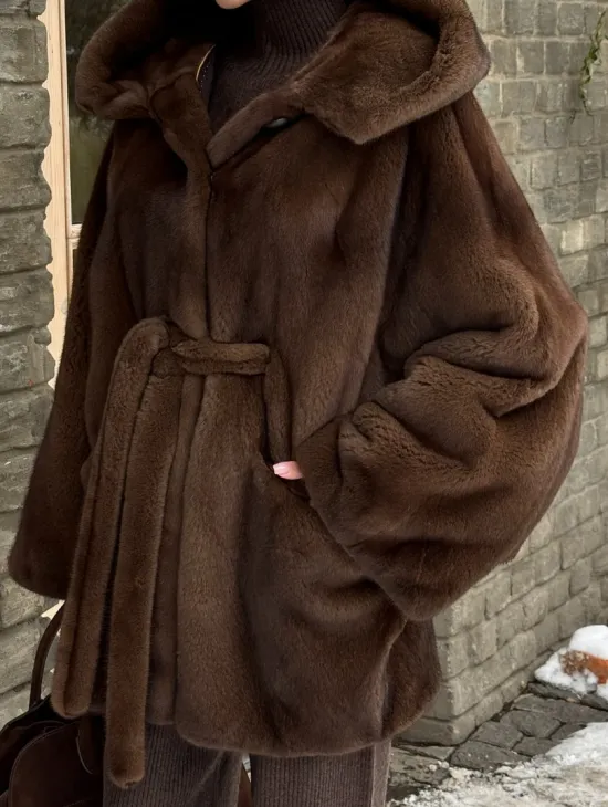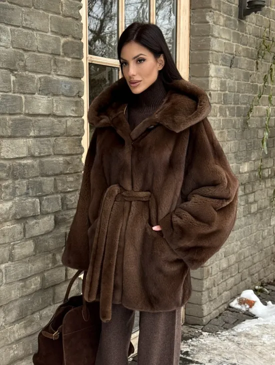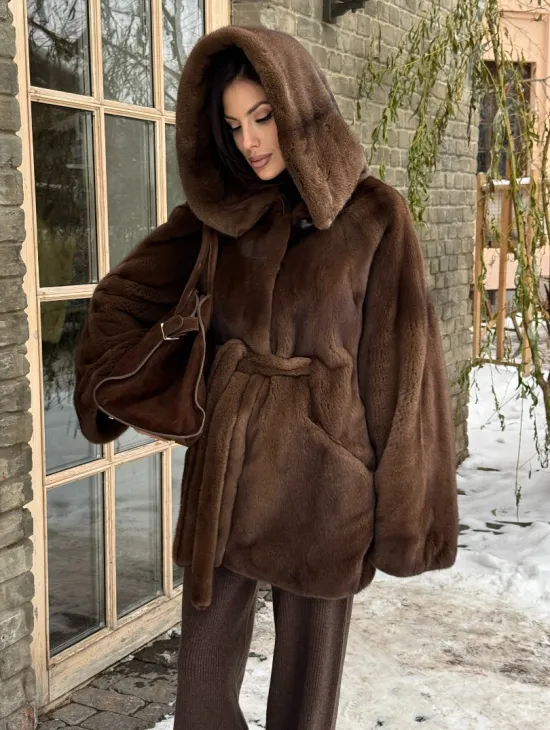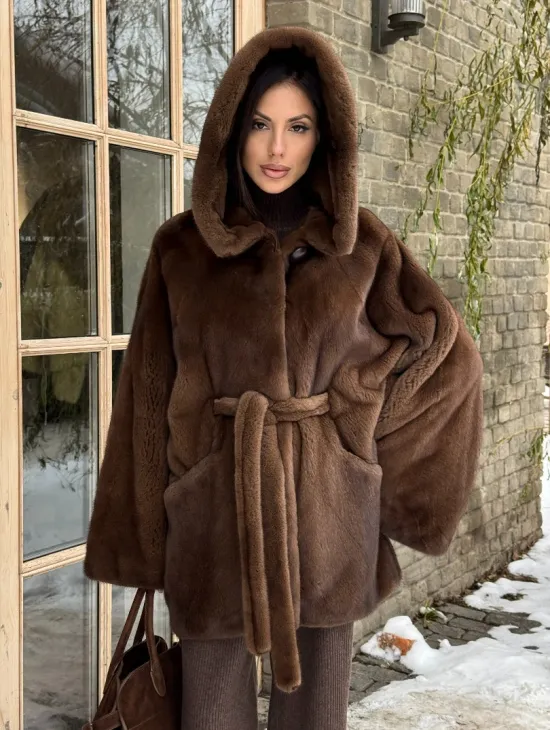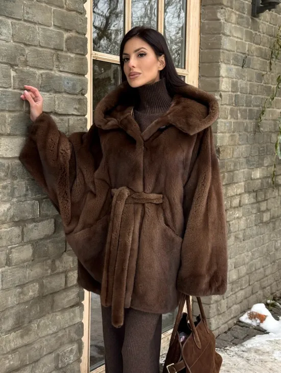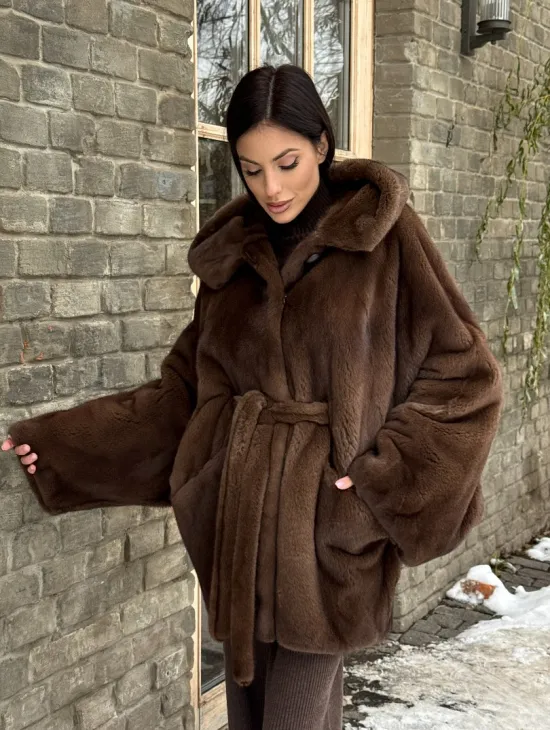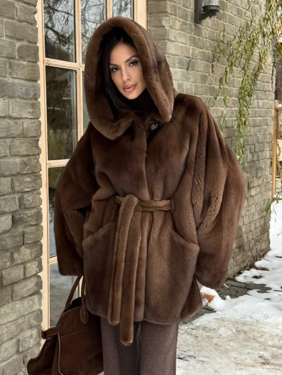 Шуба летучая мышь мех NAFA с капюшоном - цвет соболь