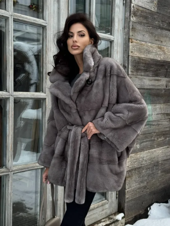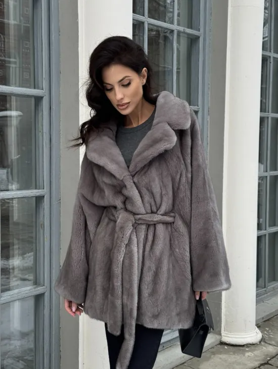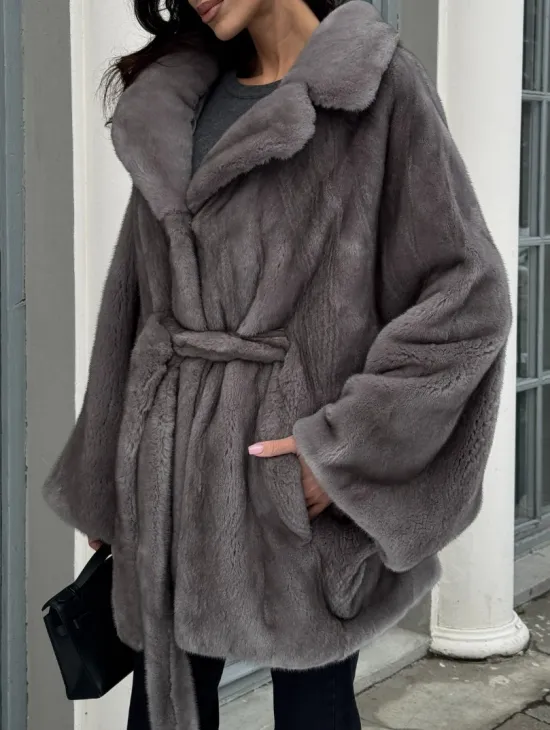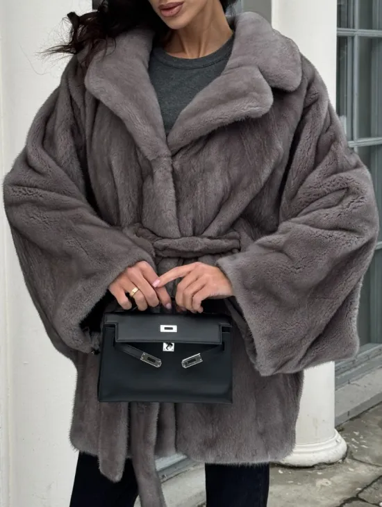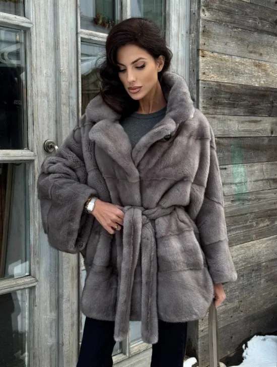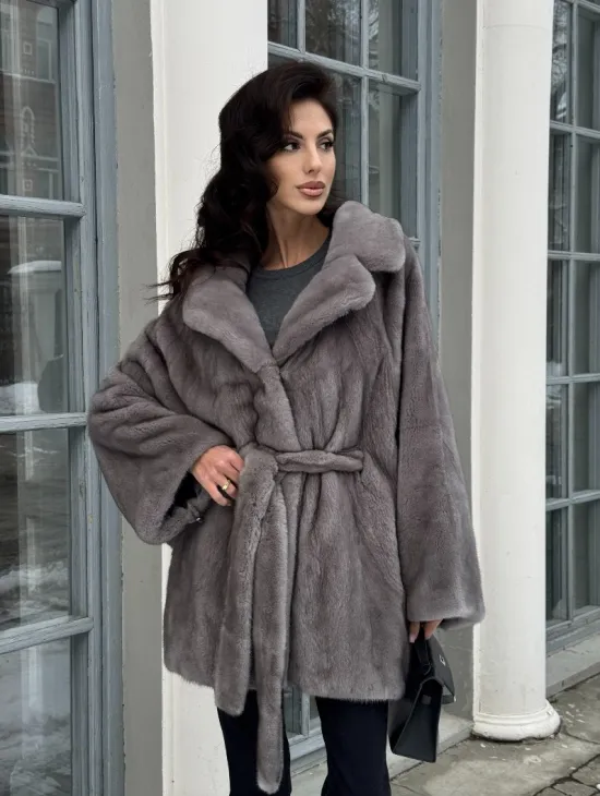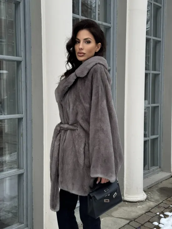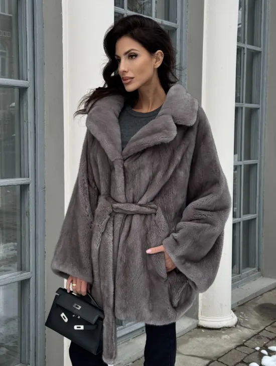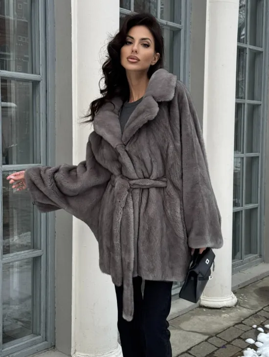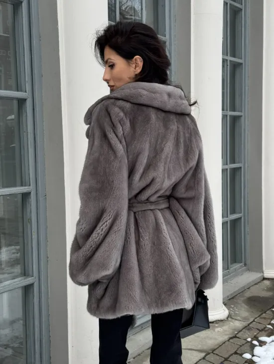 Норковая шуба в цвете графит с английским воротником - Летучая мышь