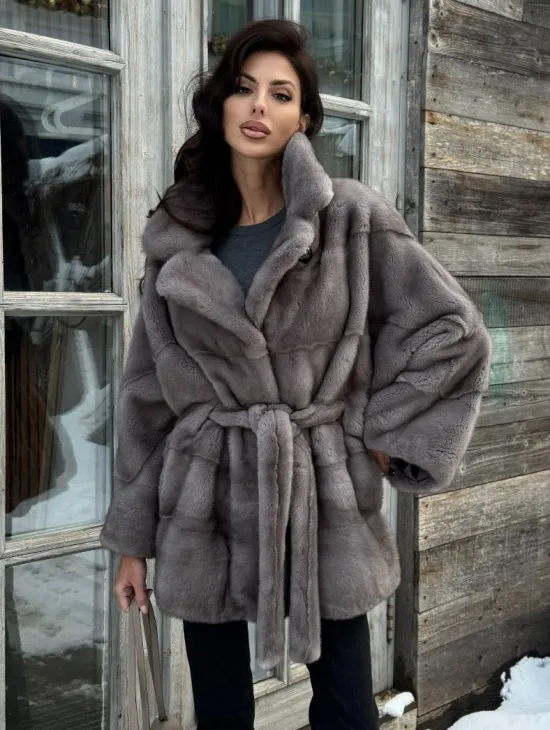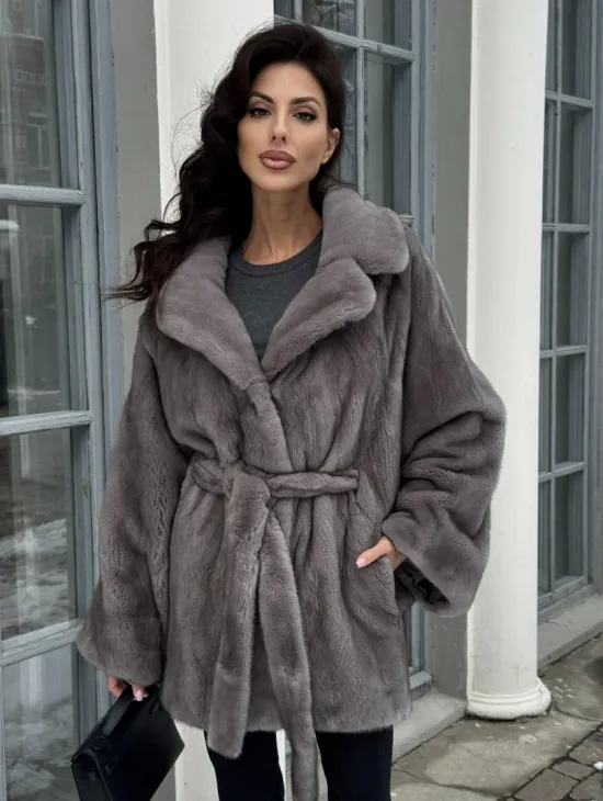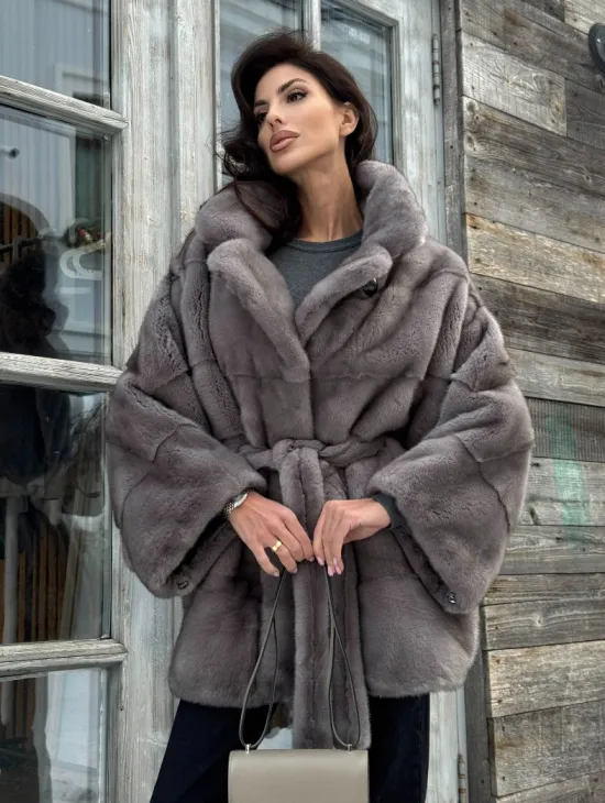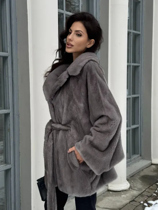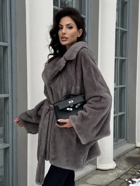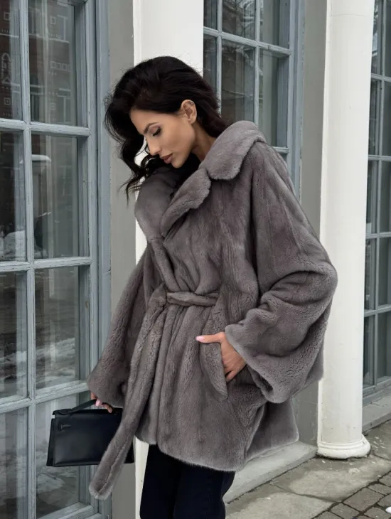 Полушубок летучая мышь из норки с воротником из куницы - цвет графит