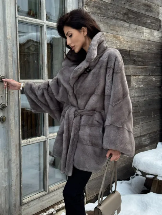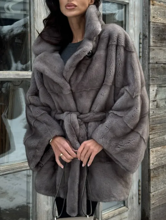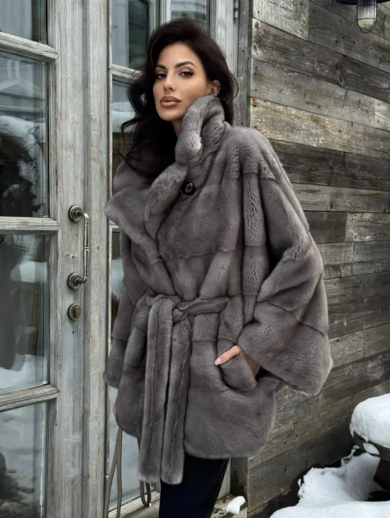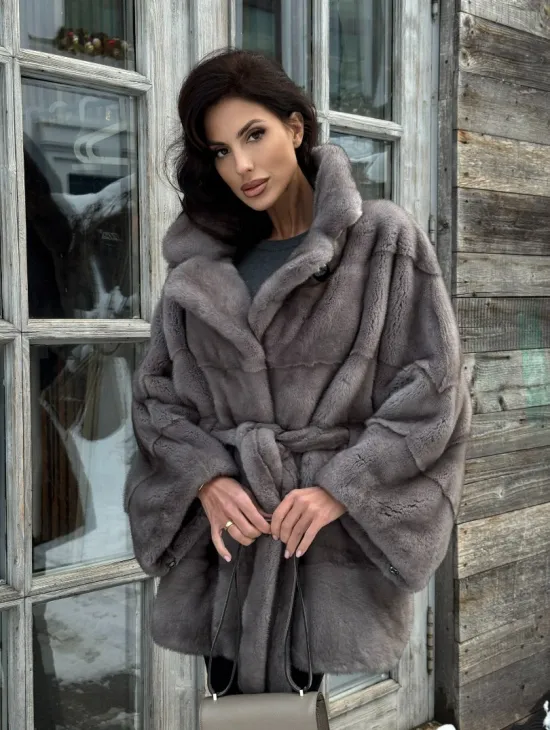 Меховое манто из норки "Летучка" с воротником из меха куницы