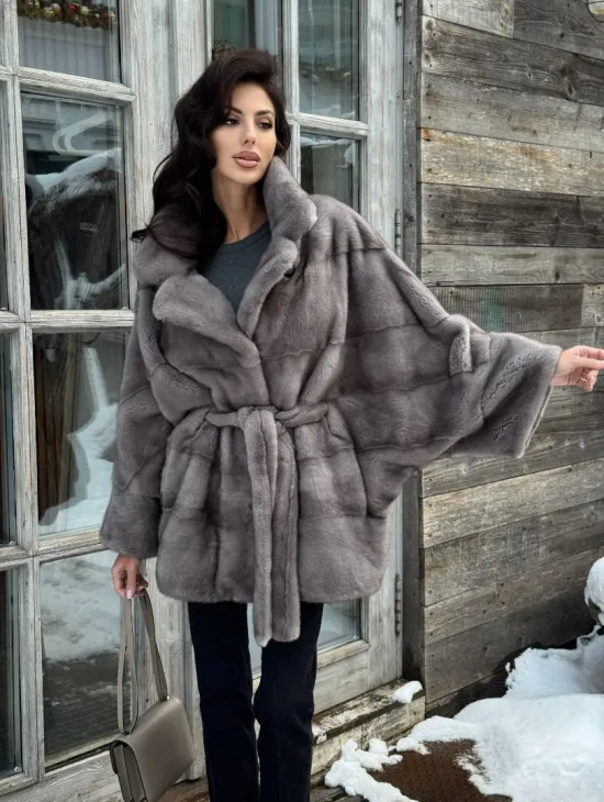 Полушубок норковый "Летучая мышь" с воротником из меха куницы