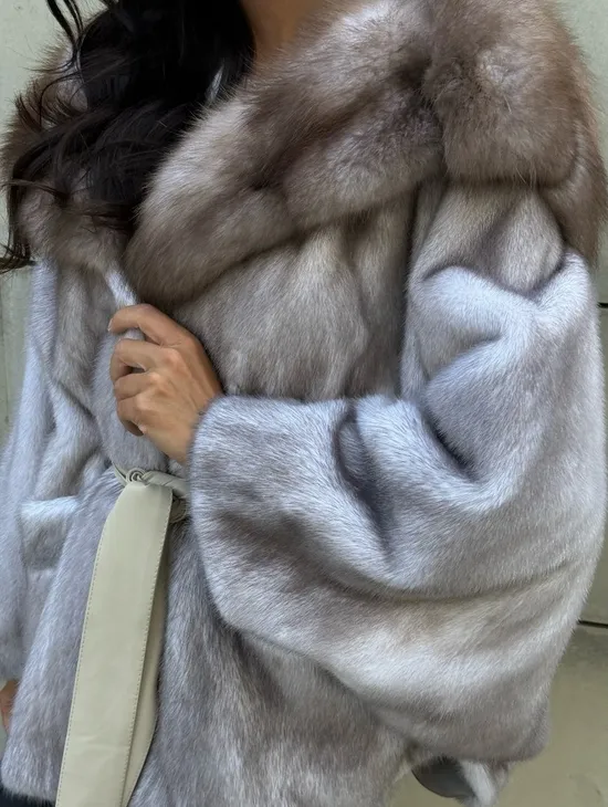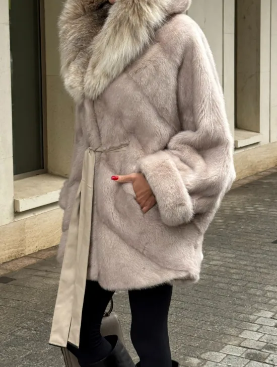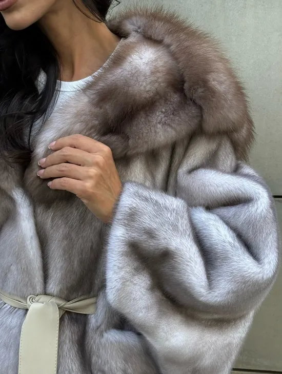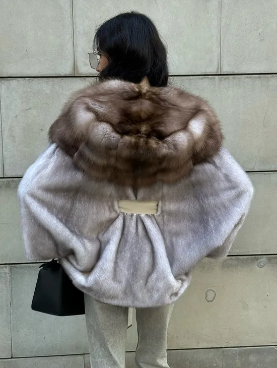 Шуба летучая мышь из меха норки с капюшоном куницы в технологии роспуск