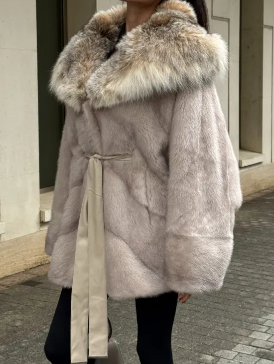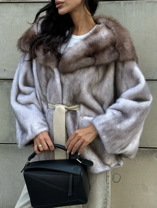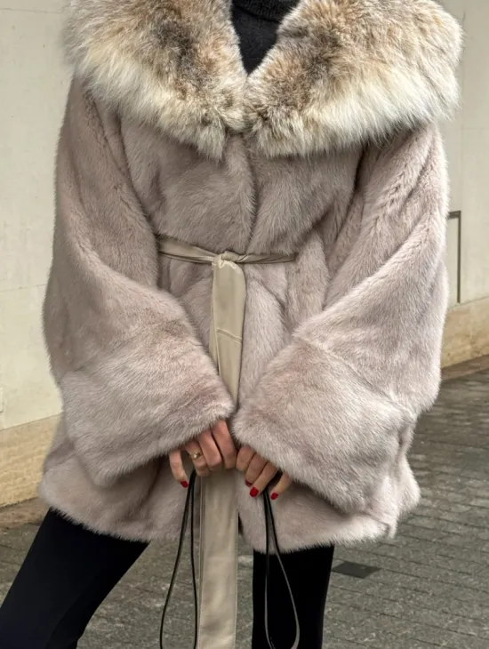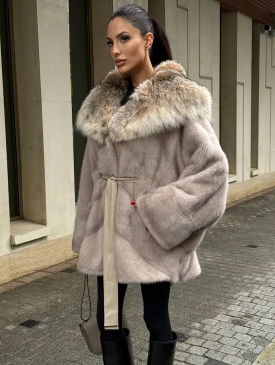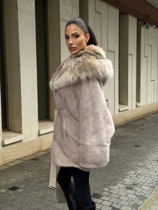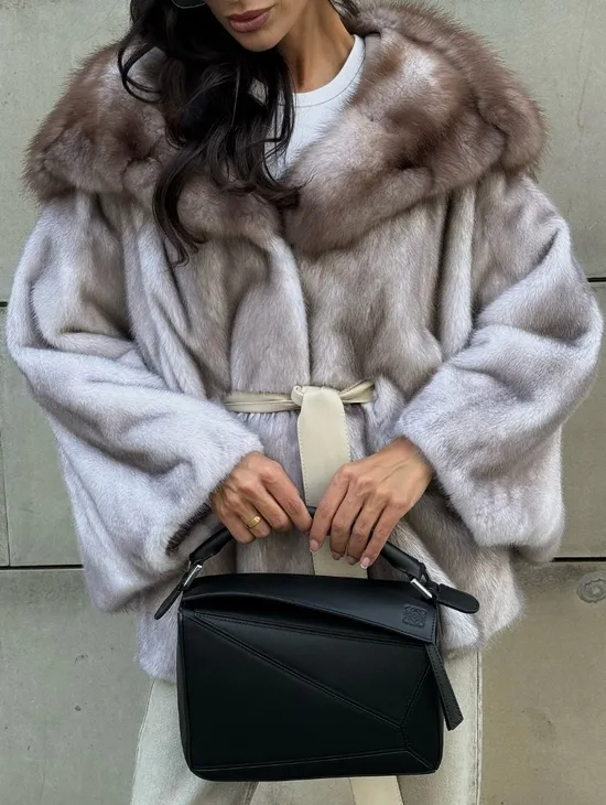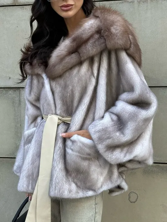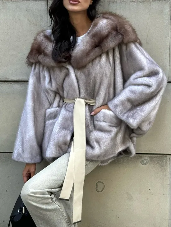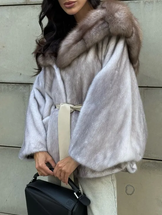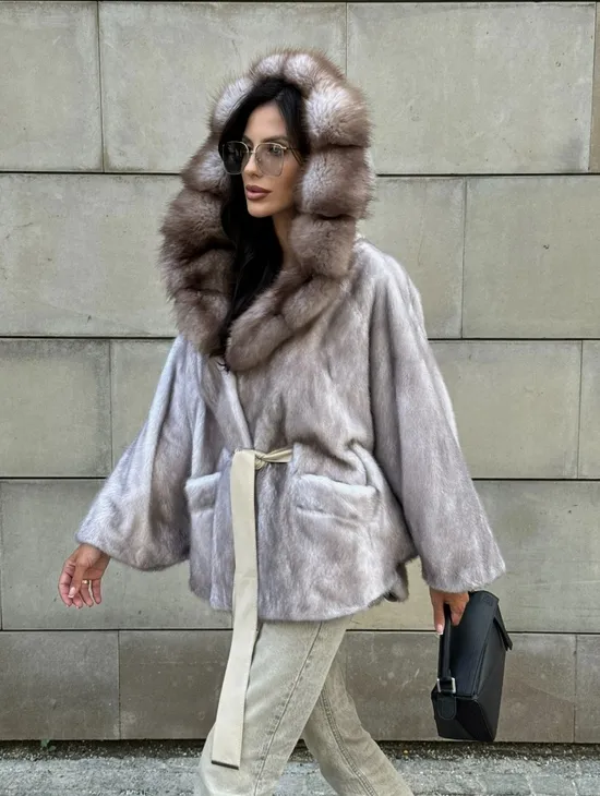 Норка роспуск с капюшоном из меха рыси, летучая мышь - цвет жемчуг