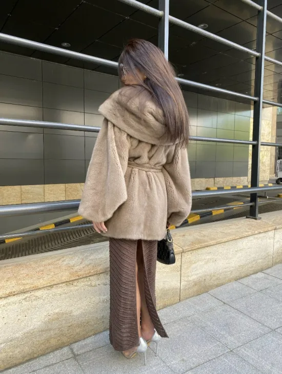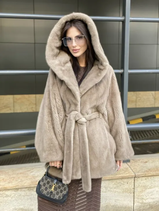 Полушубок из натурального меха норки Nafa mink в цвете соболь с капюшоном, фасон - летучая мышь
