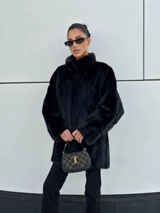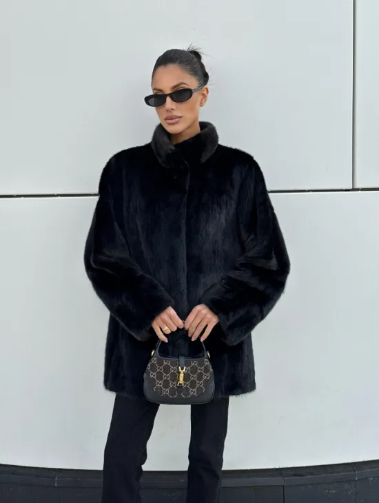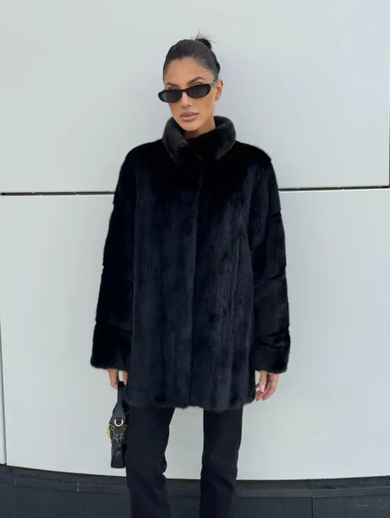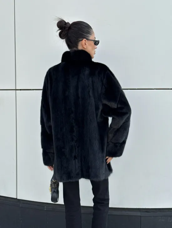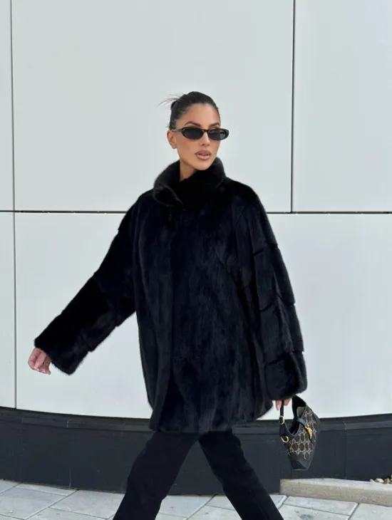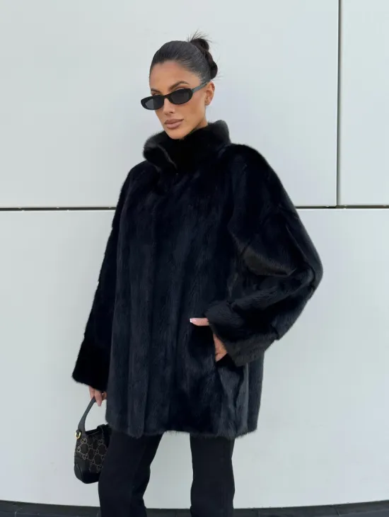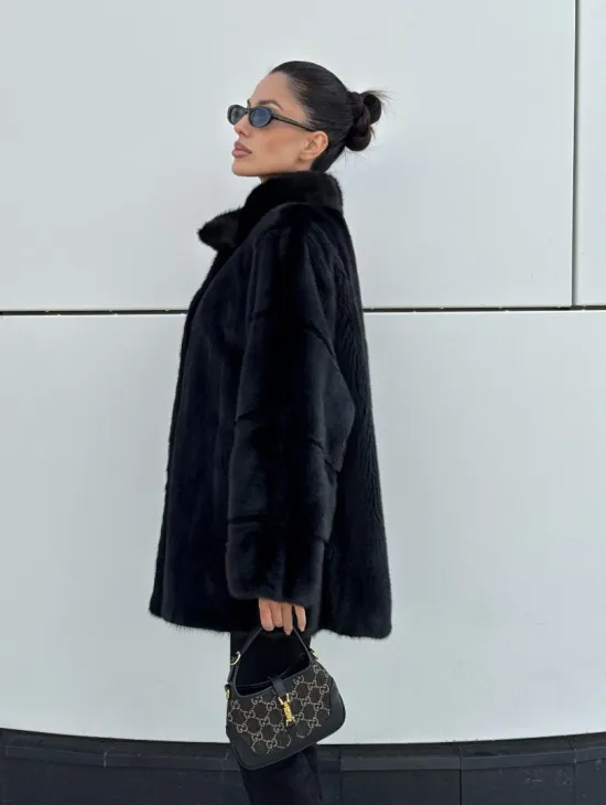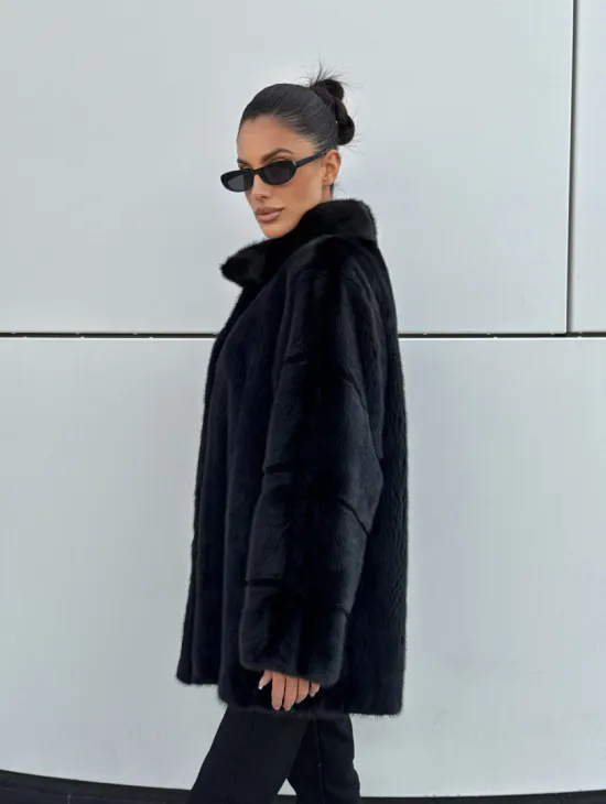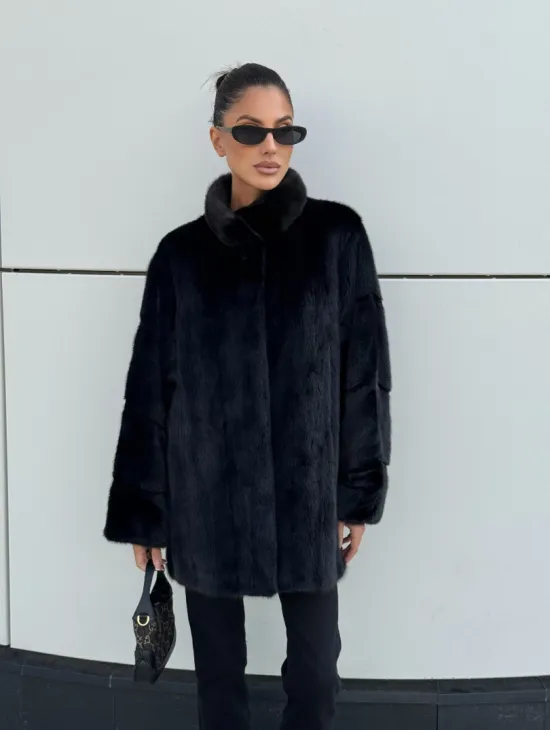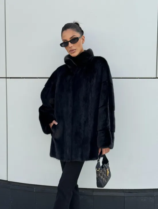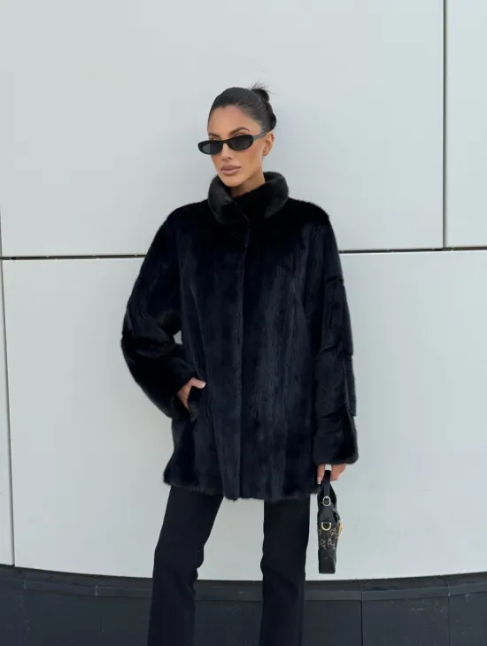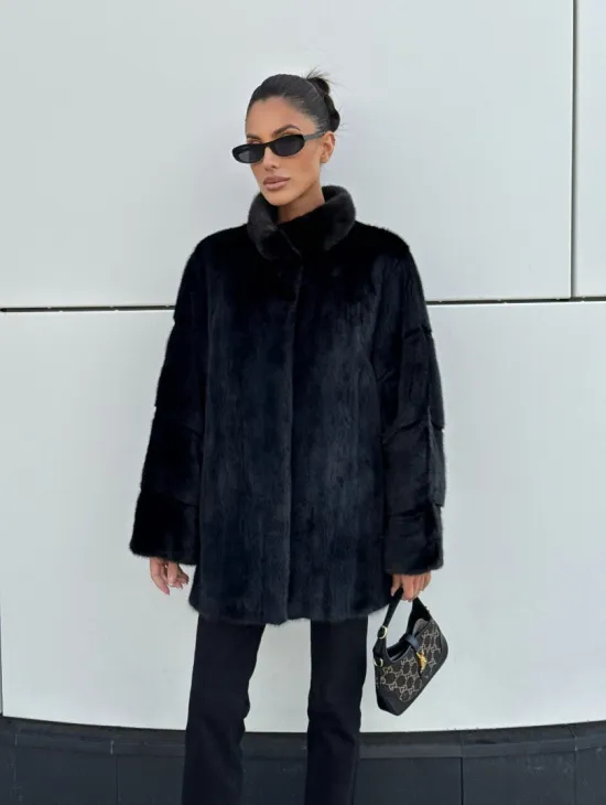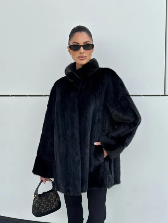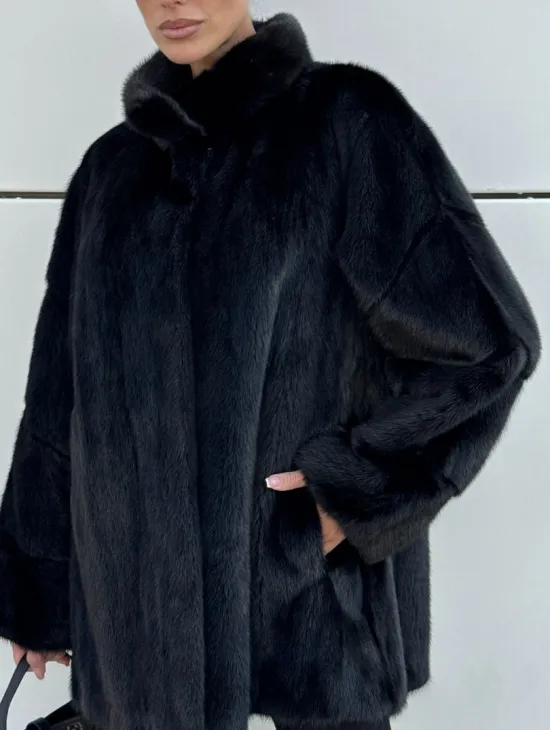 Черная натуральная норковая шуба летучка с V-образным воротником