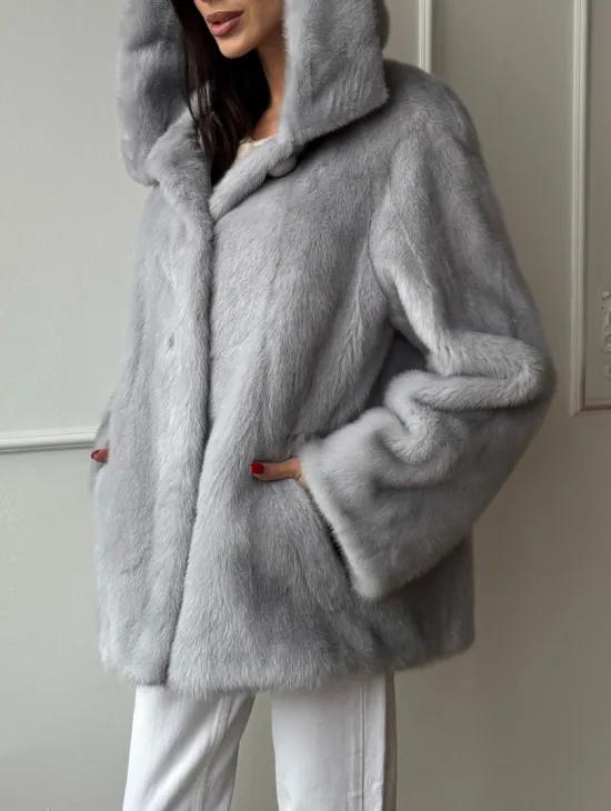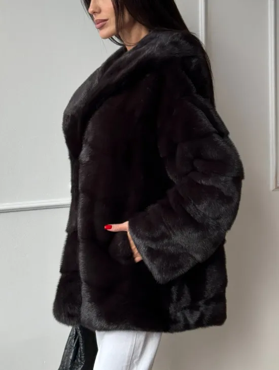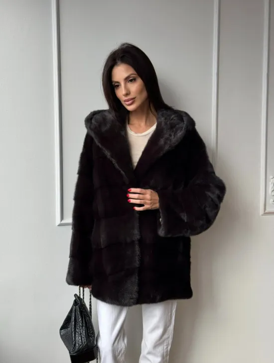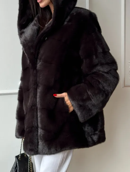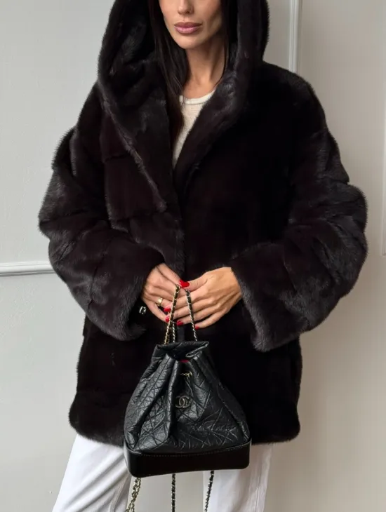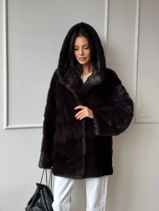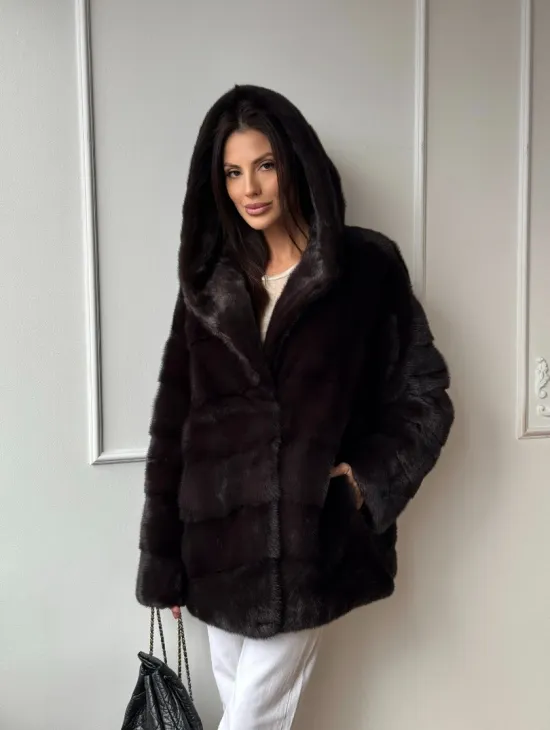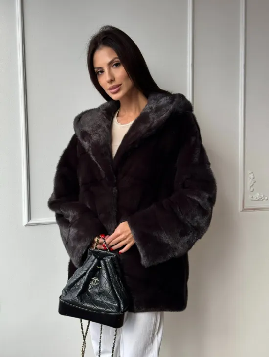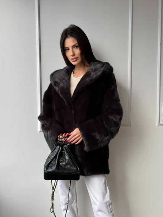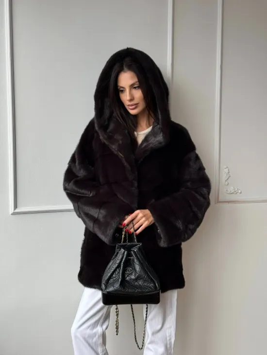 Меховая шубка с капюшоном из аукционной норки в цвете уголь
