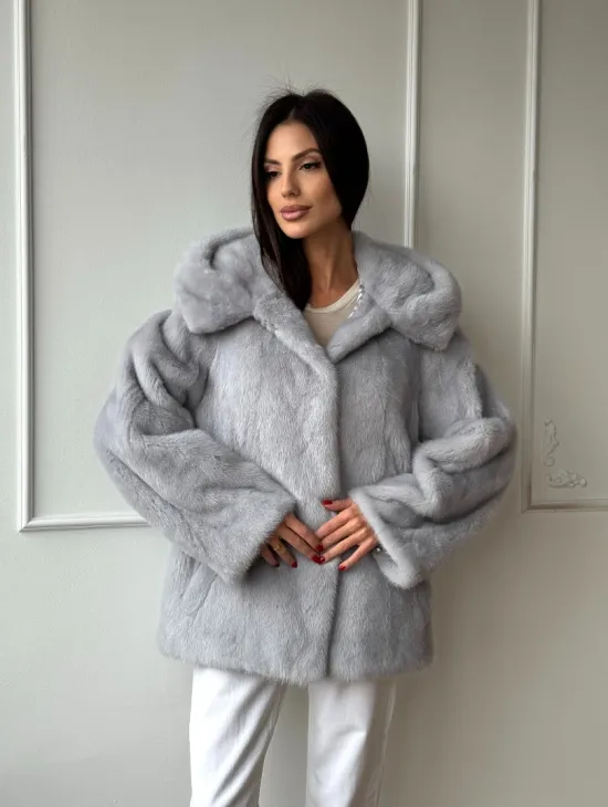 Короткая норковая шуба с английским воротником - цвет графит
