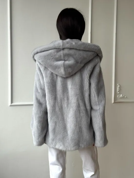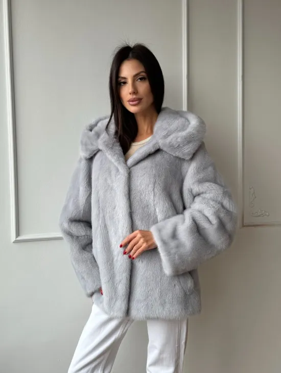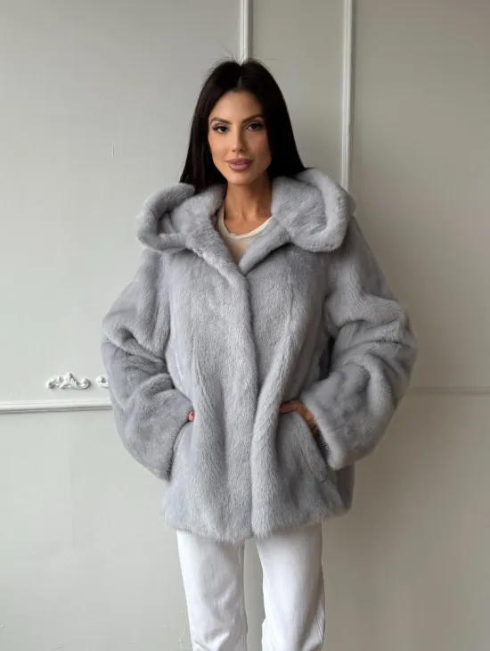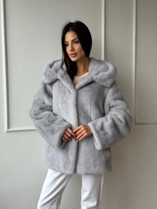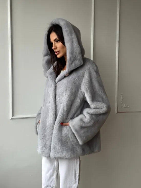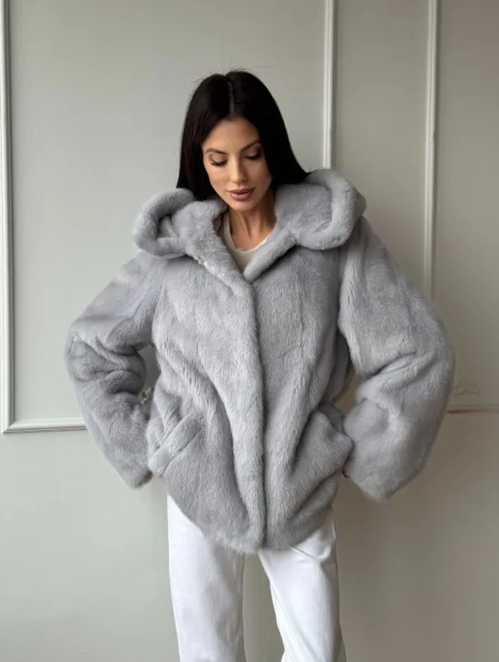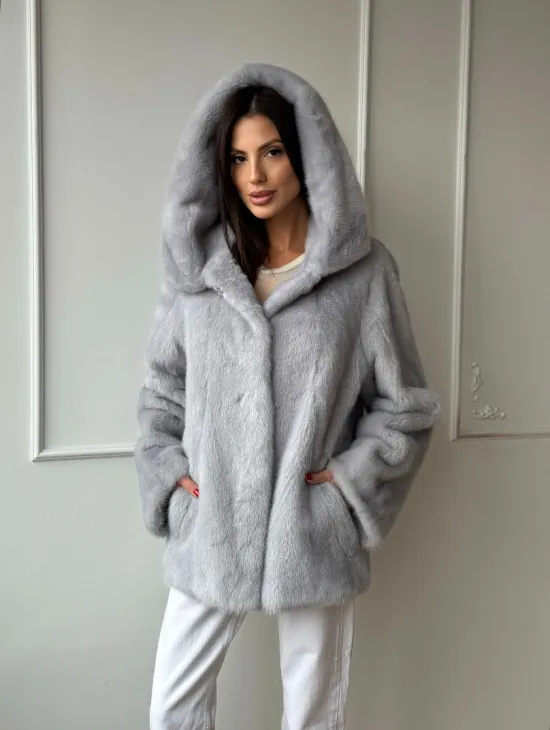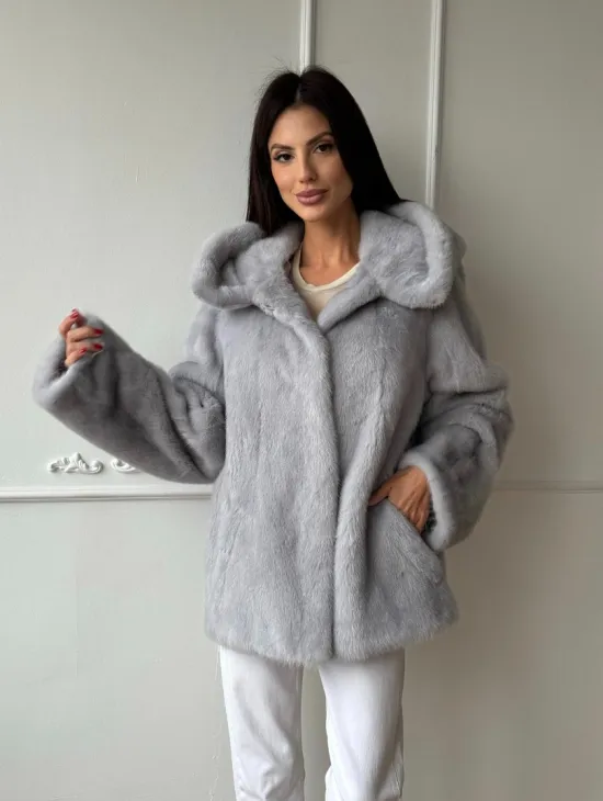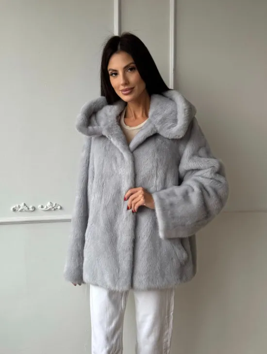 Женский норковый полушубок автоледи с капюшоном из голубой норки