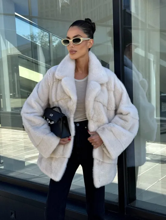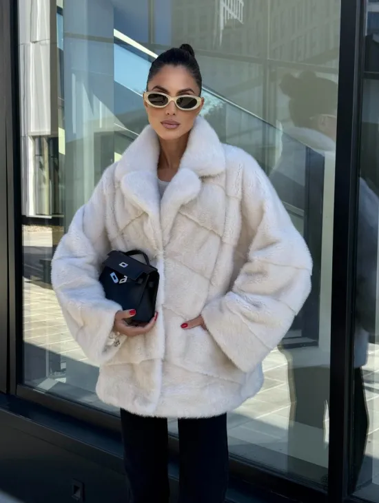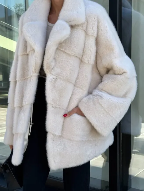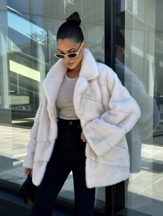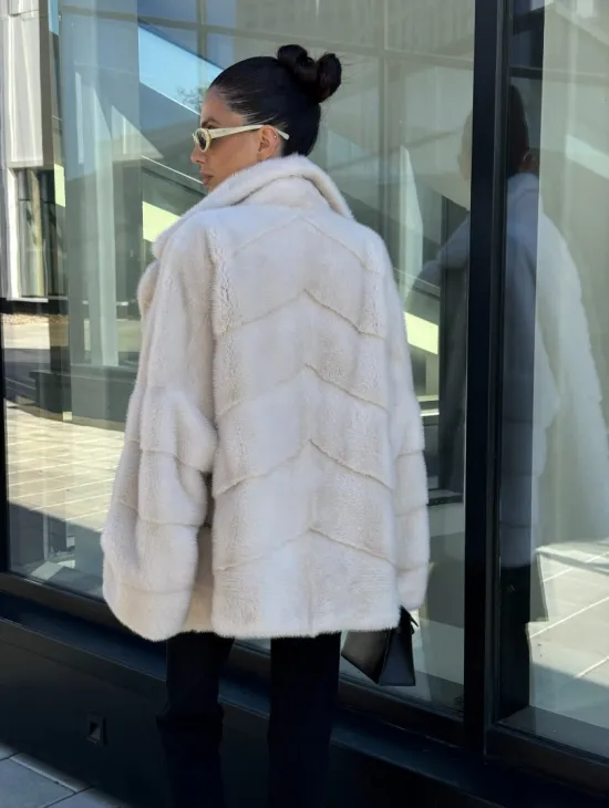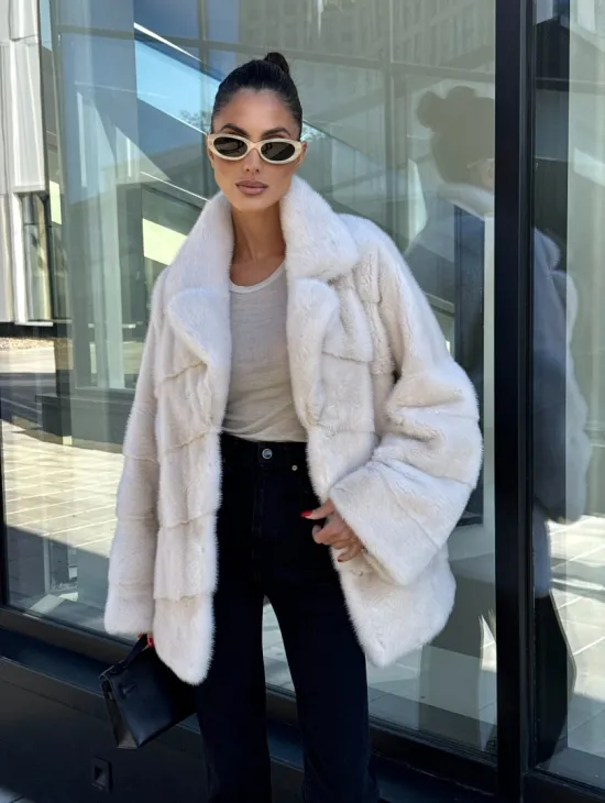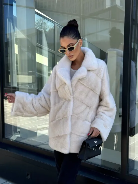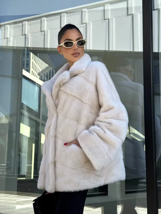 Короткая норковая шуба с английским воротником - цвет ваниль