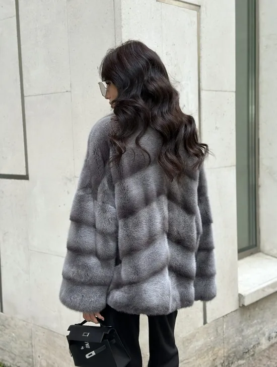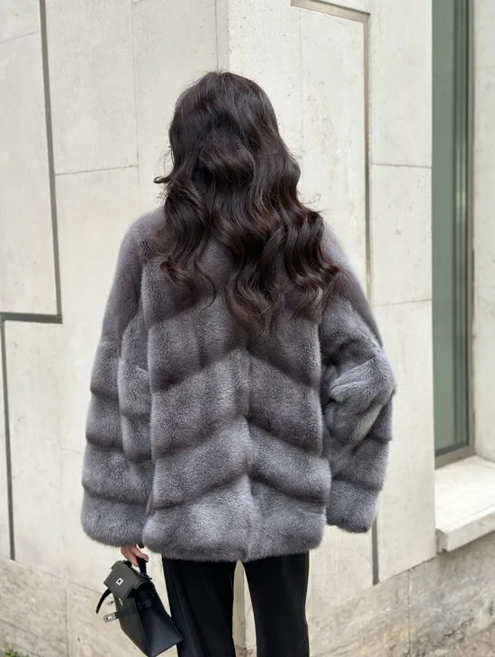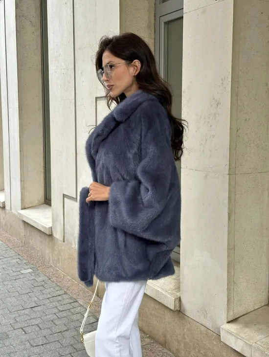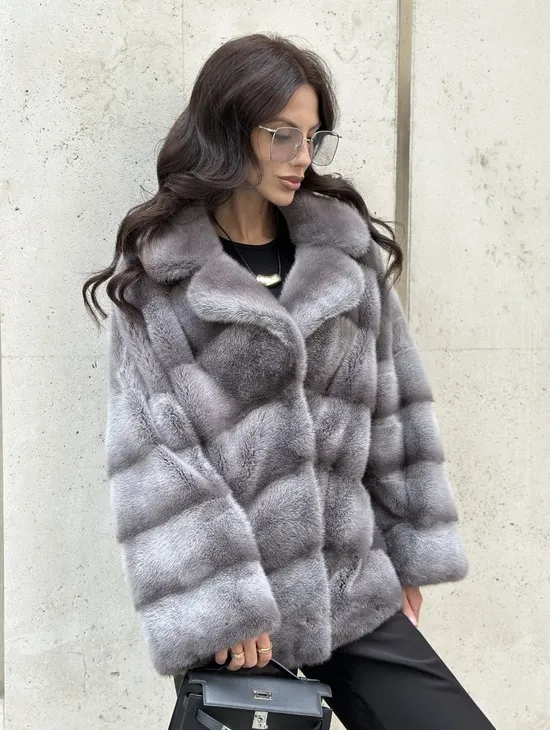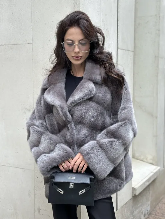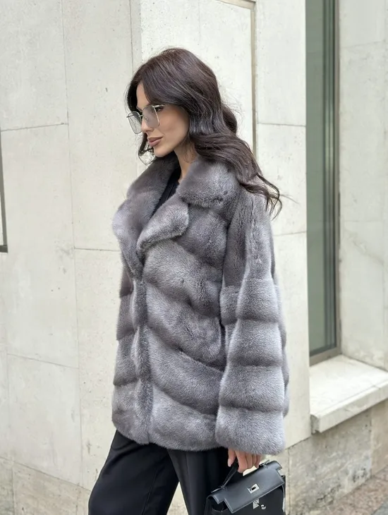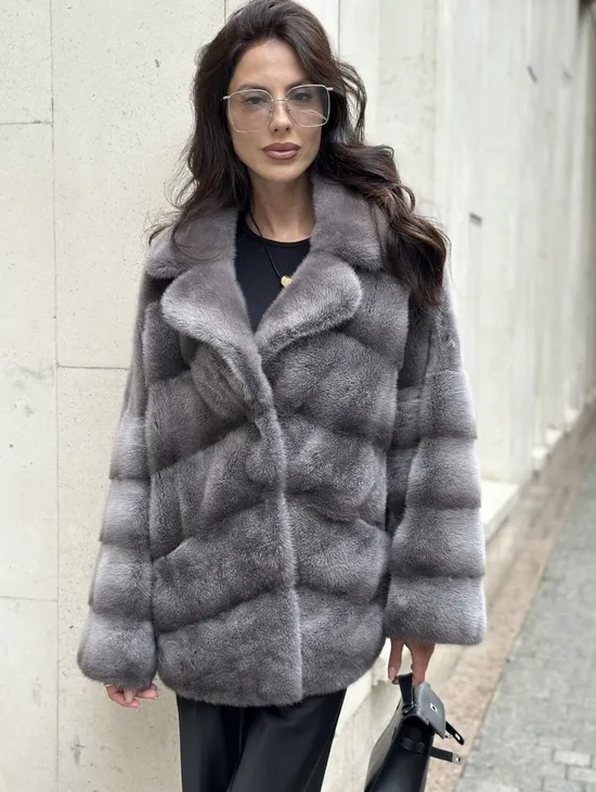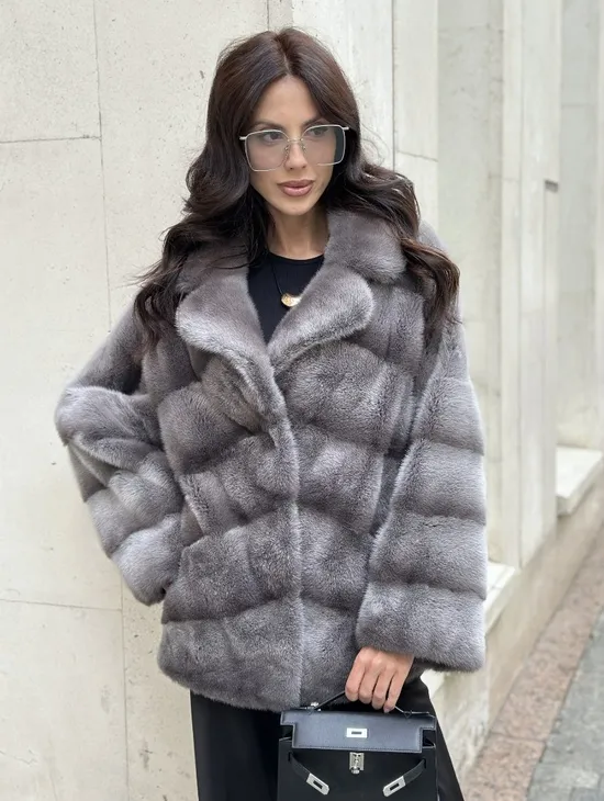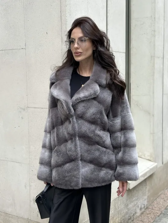 Норковый полушубок паркет английский воротник - цвет серый сапфир