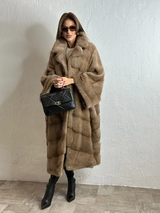 Шуба из меха норки с воротником из куницы - цвет соболь