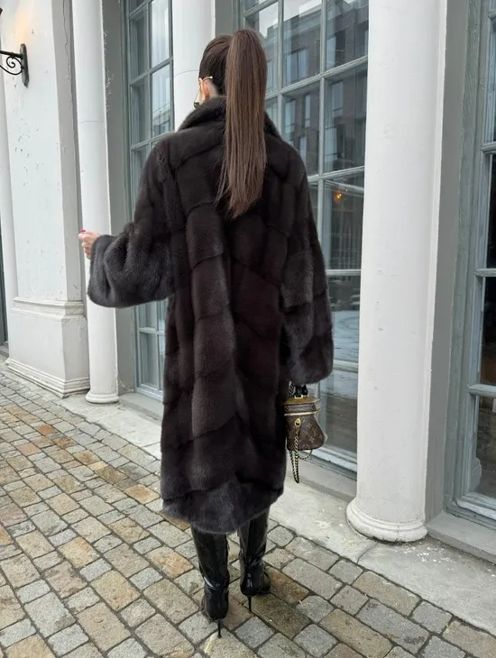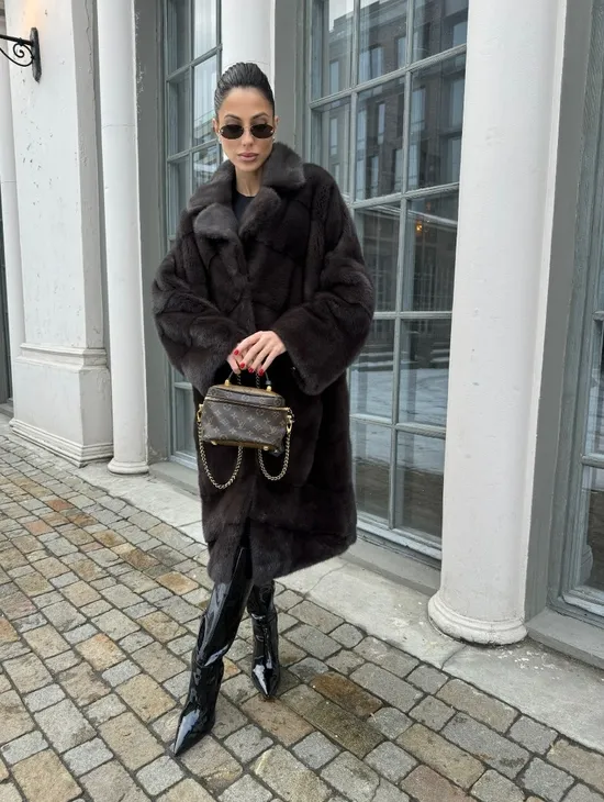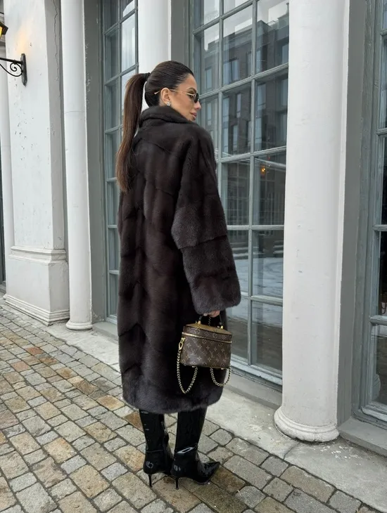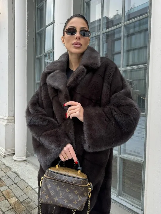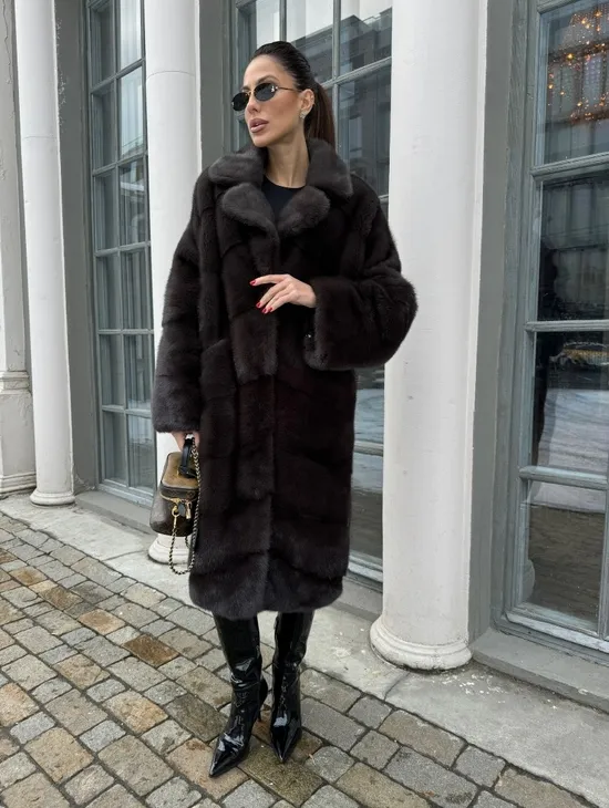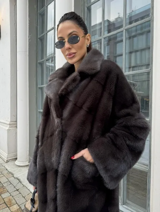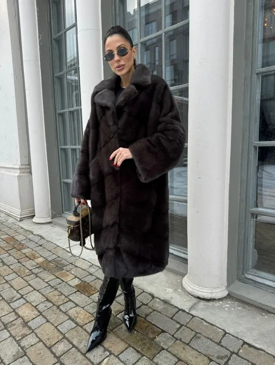Шуба свободного силуэта из меха норки, английский воротник - цвет орех
